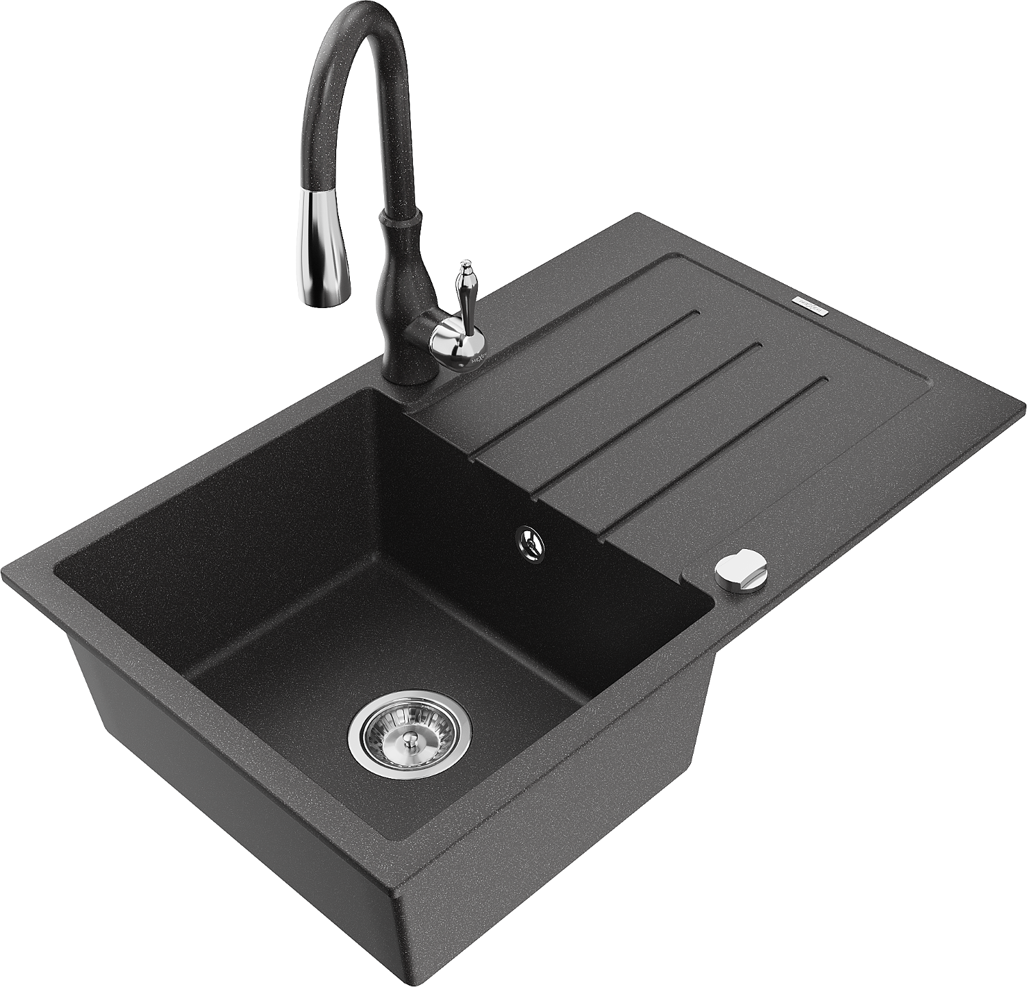 Mexen Bruno granitový dřez 1-komorový s odkapávačem a kuchyňskou baterií Savita, černý skvrnitý - 6513-76-672601-76