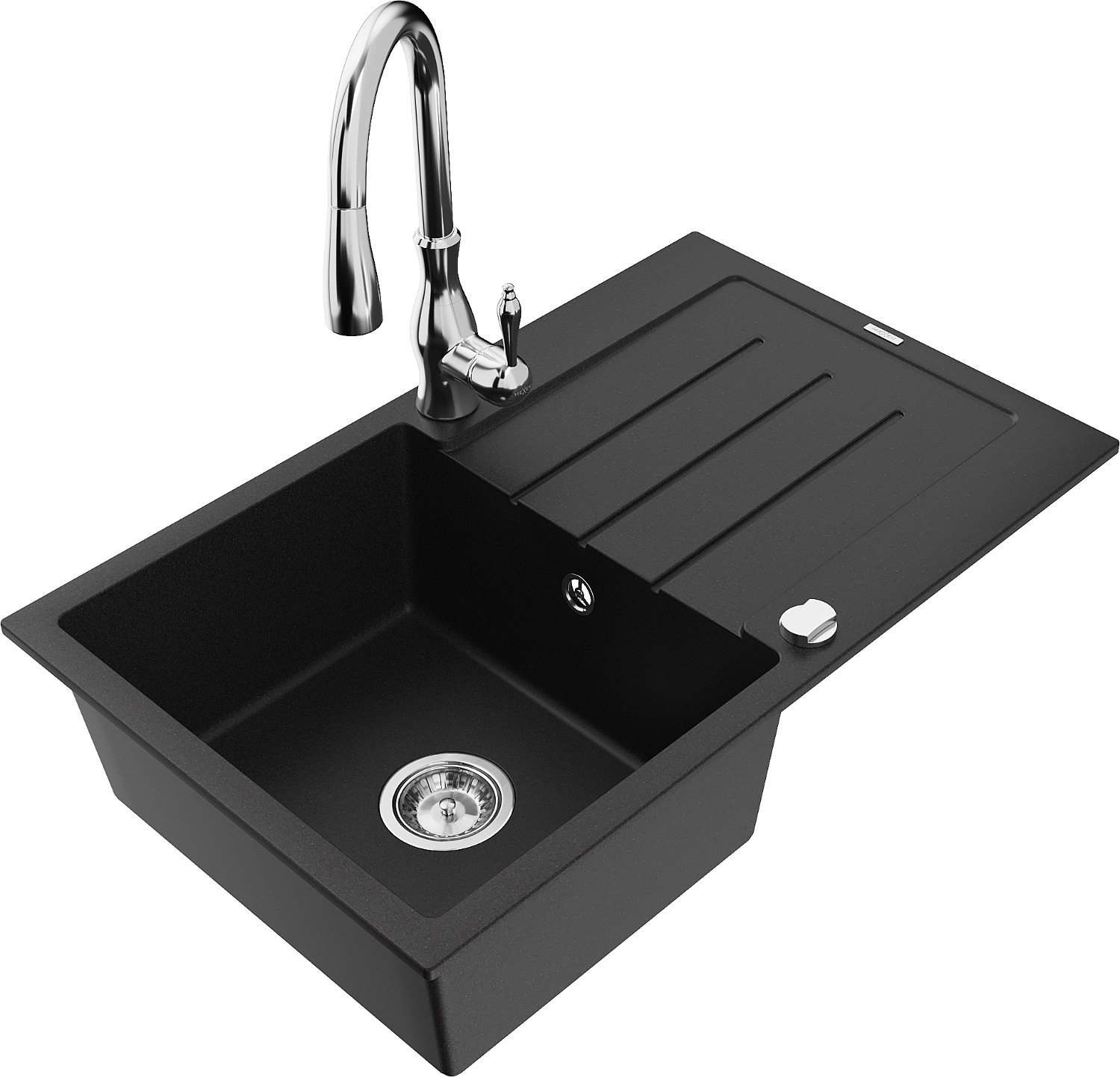 Mexen Bruno granitový dřez 1-komorový s odkapávačem a kuchyňskou baterií Savita, černý - 6513-77-672601-00