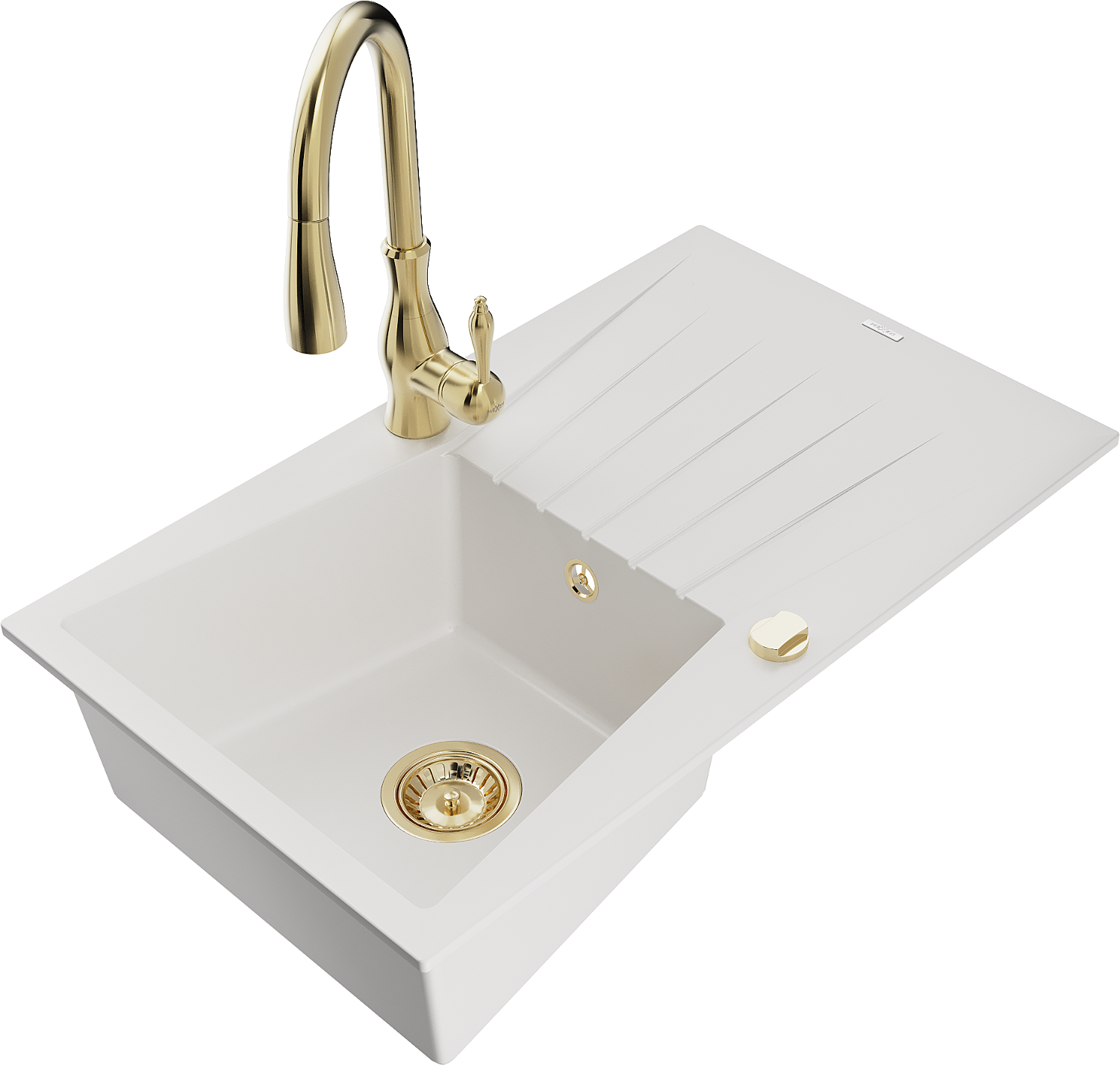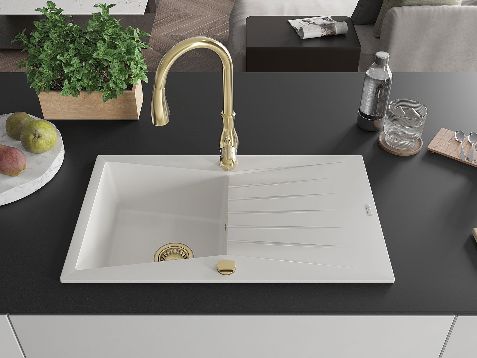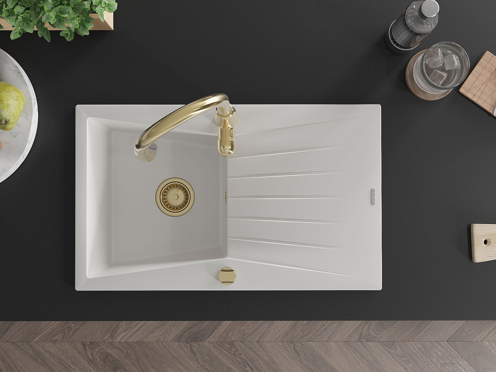 Mexen Cesar granitový dřez 1-komorový s odkapávačem a kuchyňskou baterií Savita, bílý - 6514-20-672601-50