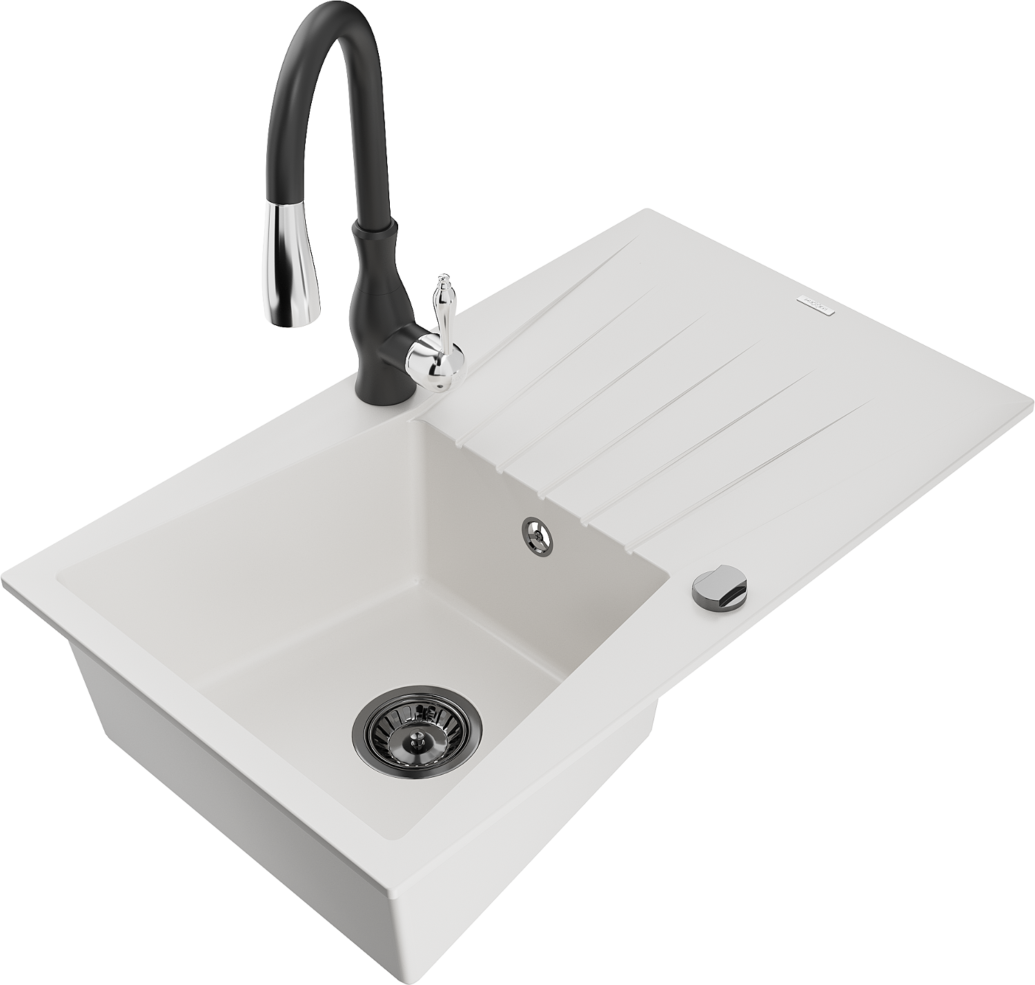 Mexen Cesar granitový dřez 1-komorový s odkapávačem a kuchyňskou baterií Savita, bílý - 6514-20-672601-70
