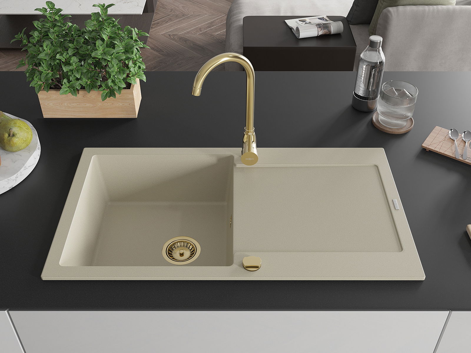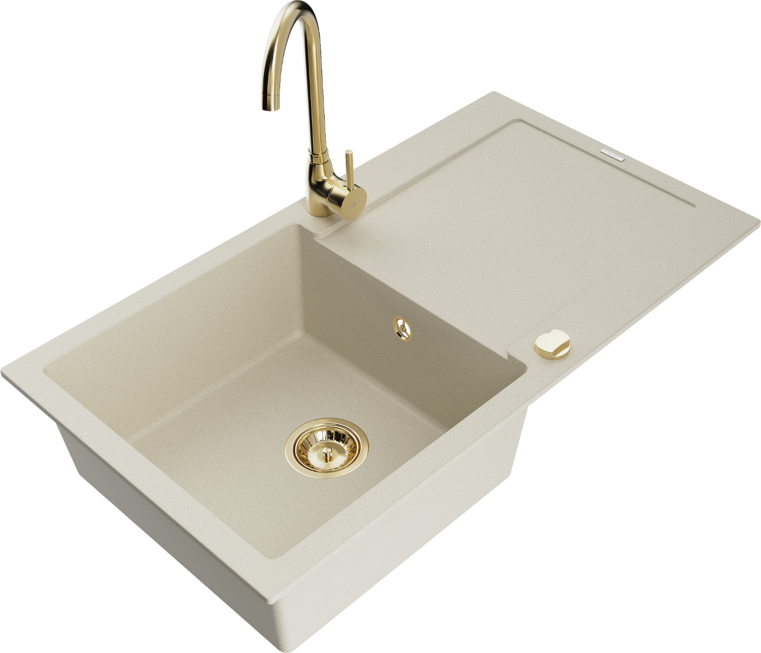 Mexen Leo granitový dřez 1-komorový s odkapávačem a kuchyňskou baterií Telma, béžový - 6501-69-670200-50