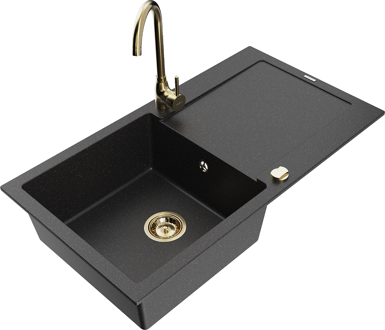 Mexen Leo granitový dřez 1-komorový s odkapávačem a kuchyňskou baterií Telma, černý/stříbrný metalický - 6501-73-670200-50