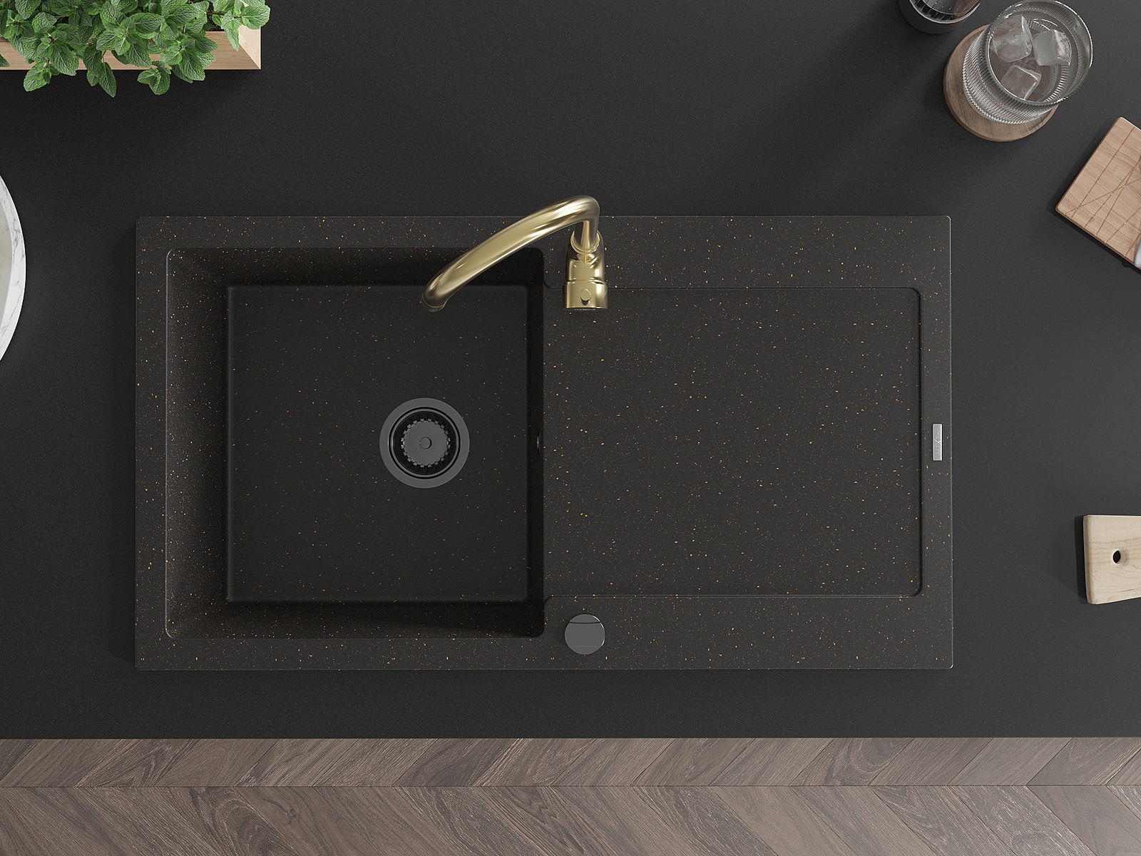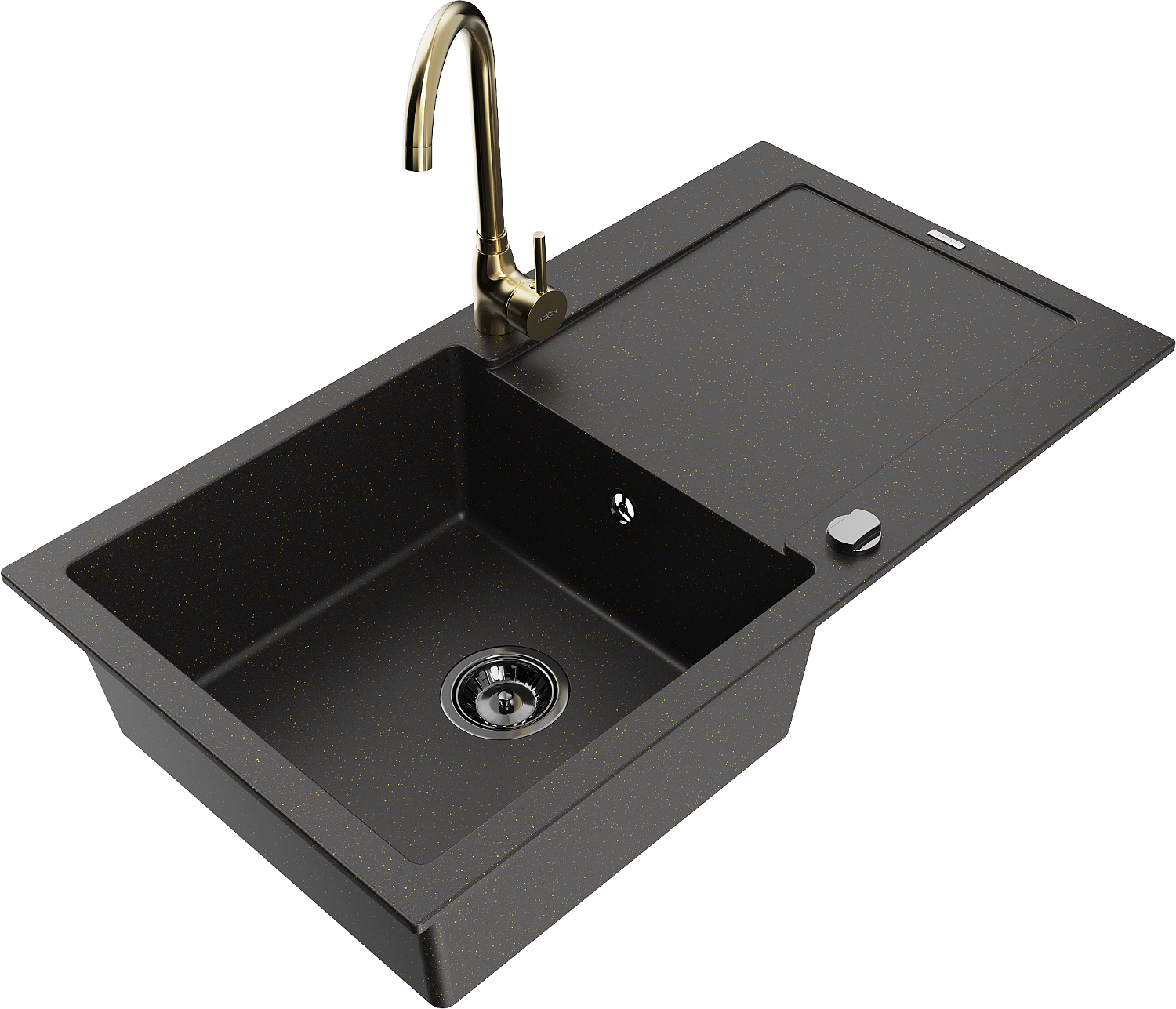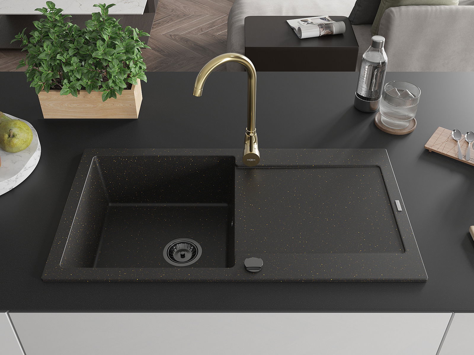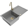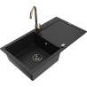 Mexen Leo granitový dřez 1-komorový s odkapávačem a kuchyňskou baterií Telma, černý/zlatý metalik - 6501-75-670200-50-B