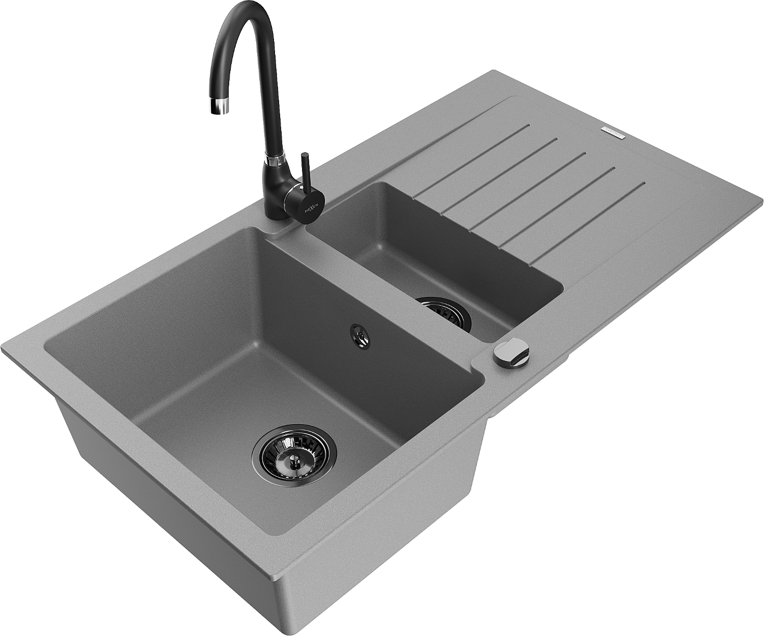 Mexen Matias žulový dřez 1,5-komorový s odkapávačem a kuchyňskou baterií Telma, šedý - 6502-71-670200-70-B