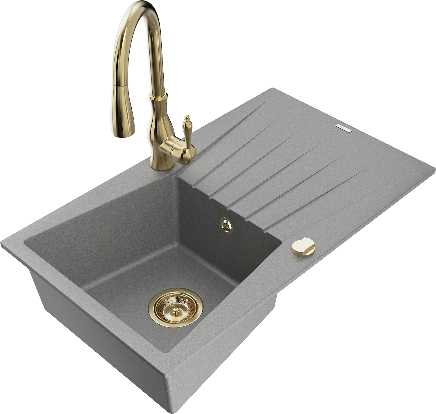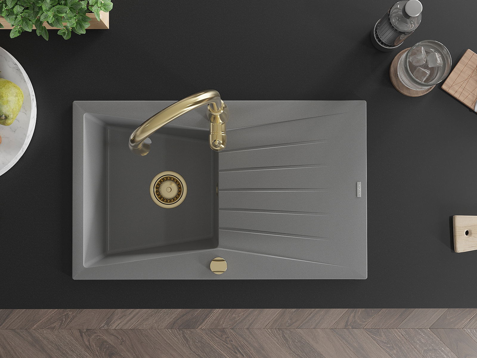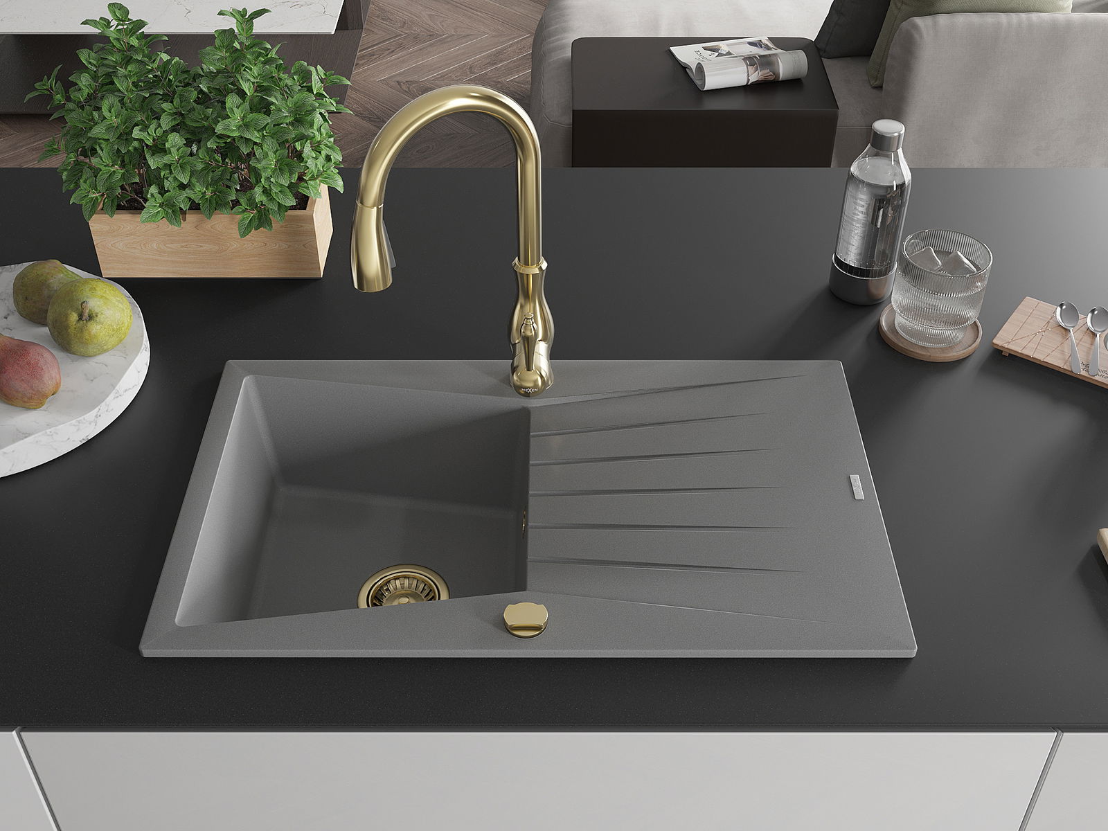 Mexen Cesar žulový dřez 1-komorový s odkapávačem a kuchyňskou baterií Savita, šedý - 6514-71-672601-50