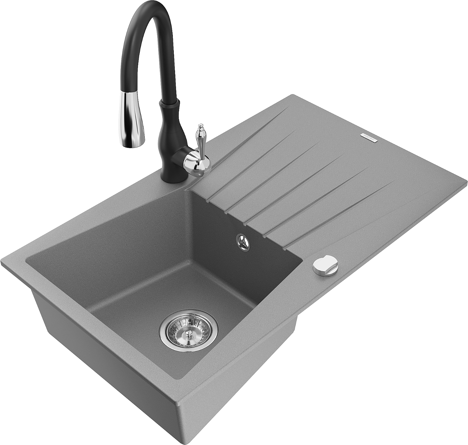 Mexen Cesar granitový dřez 1-komorový s odkapávačem a kuchyňskou baterií Savita, šedý - 6514-71-672601-70