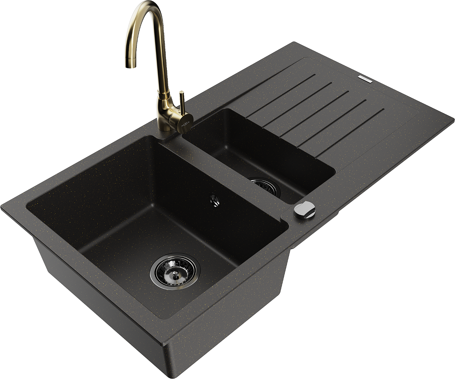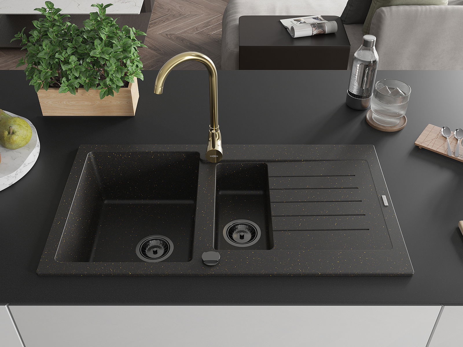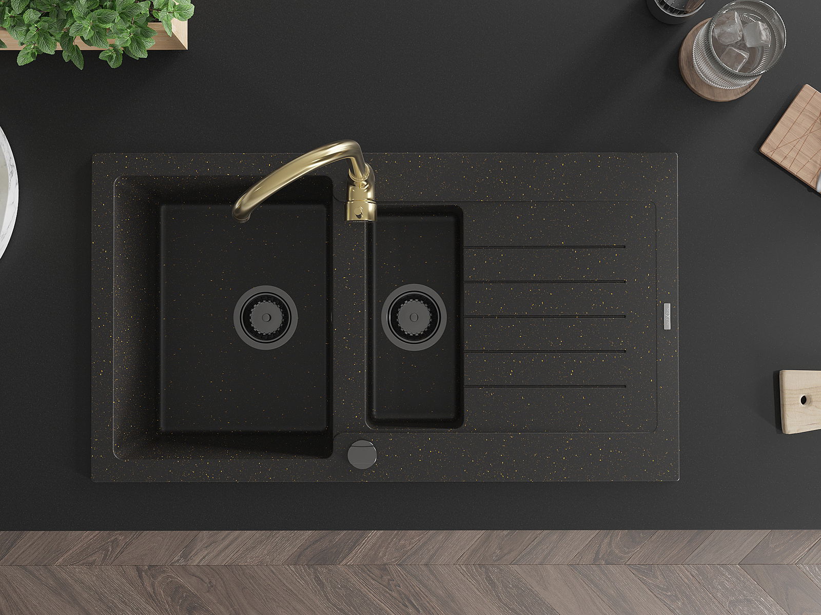 Mexen Matias granitový dřez 1,5-komorový s odkapávačem a kuchyňskou baterií Telma, černý/zlatý - 6502-75-670200-50-B