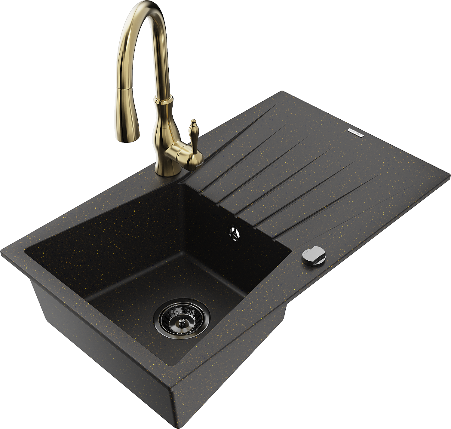 Mexen Cesar žulový dřez 1-komorový s odkapávačem a kuchyňskou baterií Savita, černý/zlatý metalický - 6514-75-672601-50-B