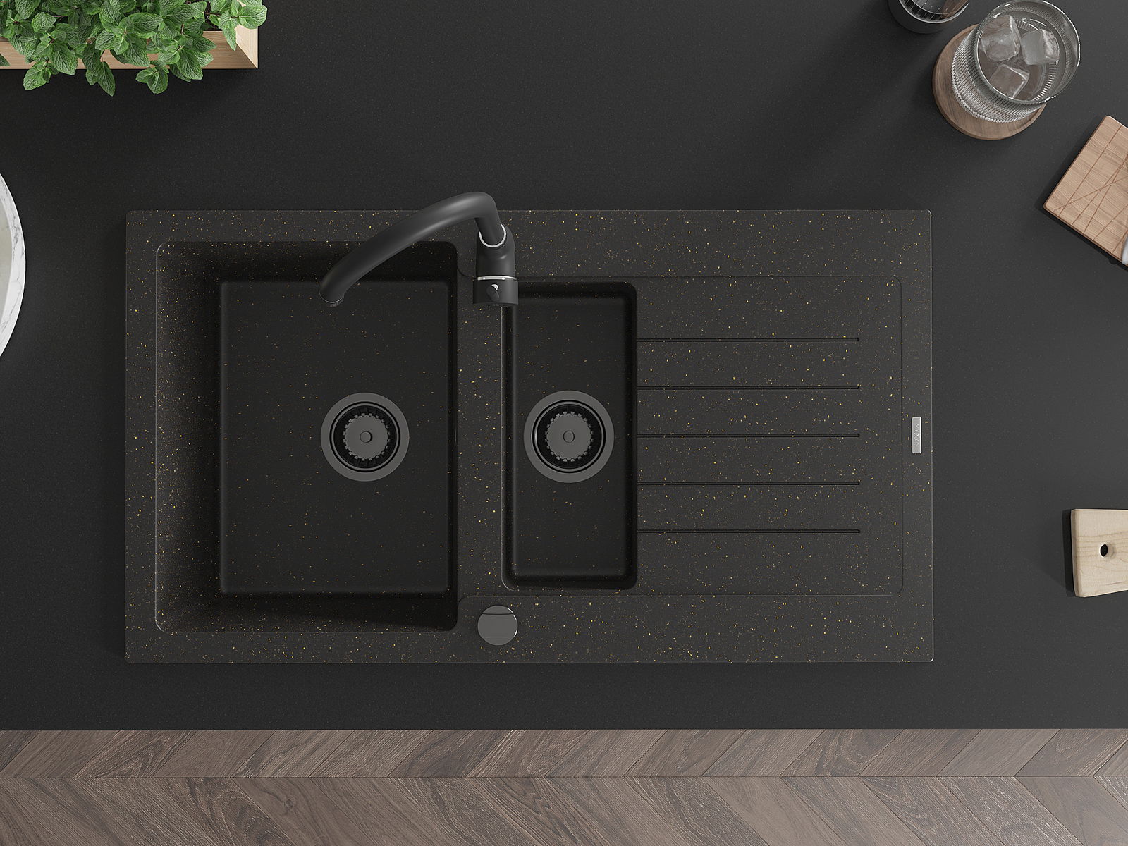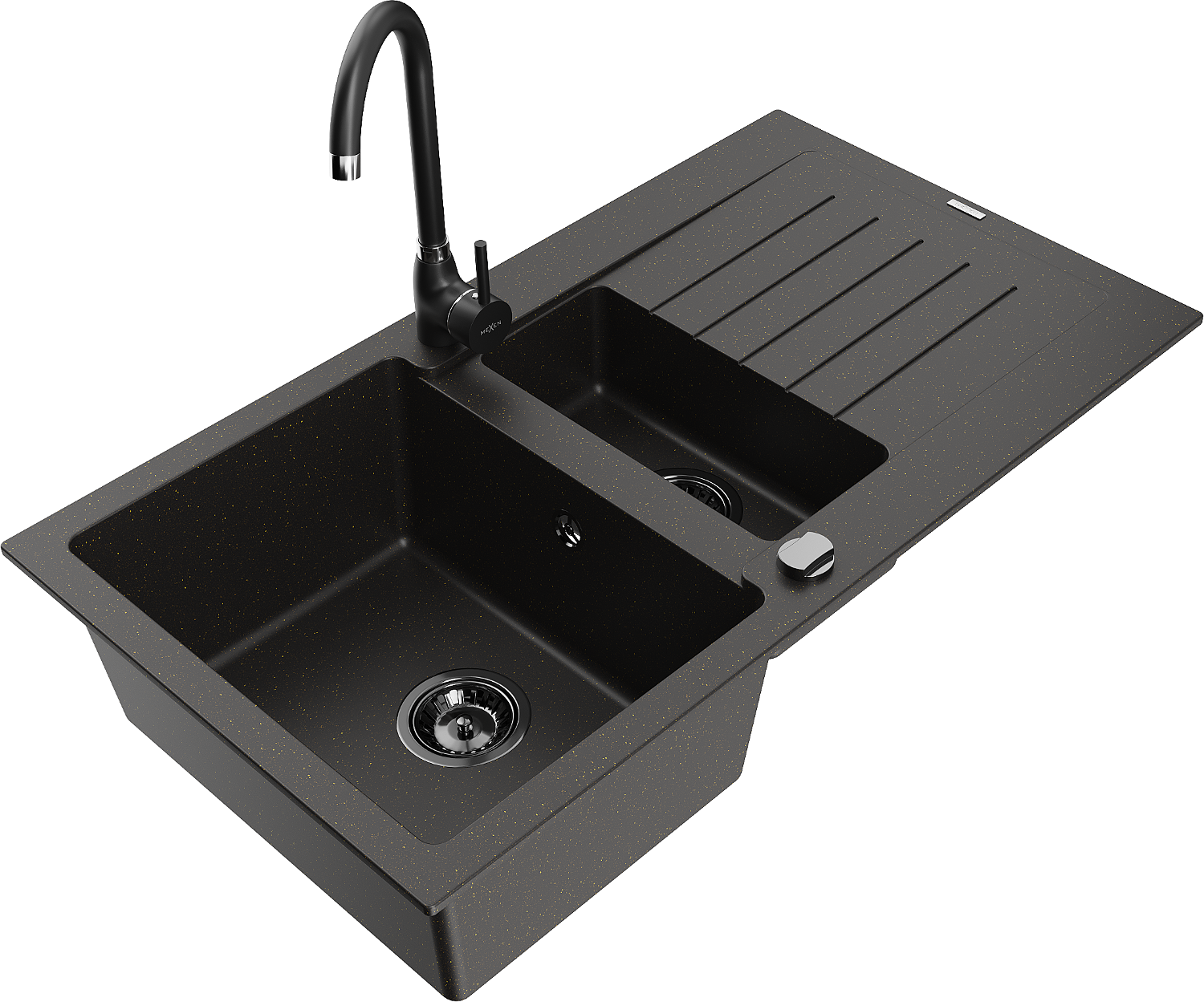 Mexen Matias granitový dřez 1,5-komorový s odkapávačem a kuchyňskou baterií Telma, černý/zlatý - 6502-75-670200-70-B