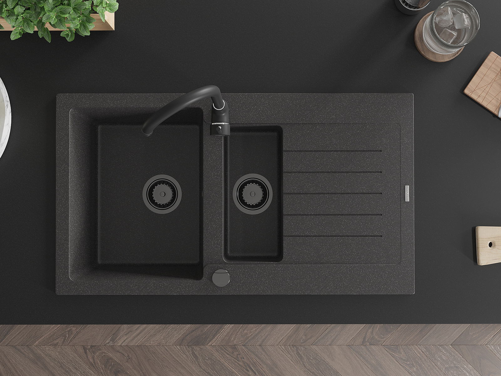 Mexen Matias granitový dřez 1,5 komorový s odkapávačem a kuchyňskou baterií Telma, černý strakatý - 6502-76-670200-70-B