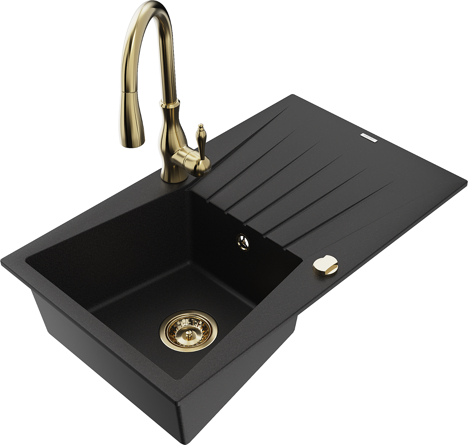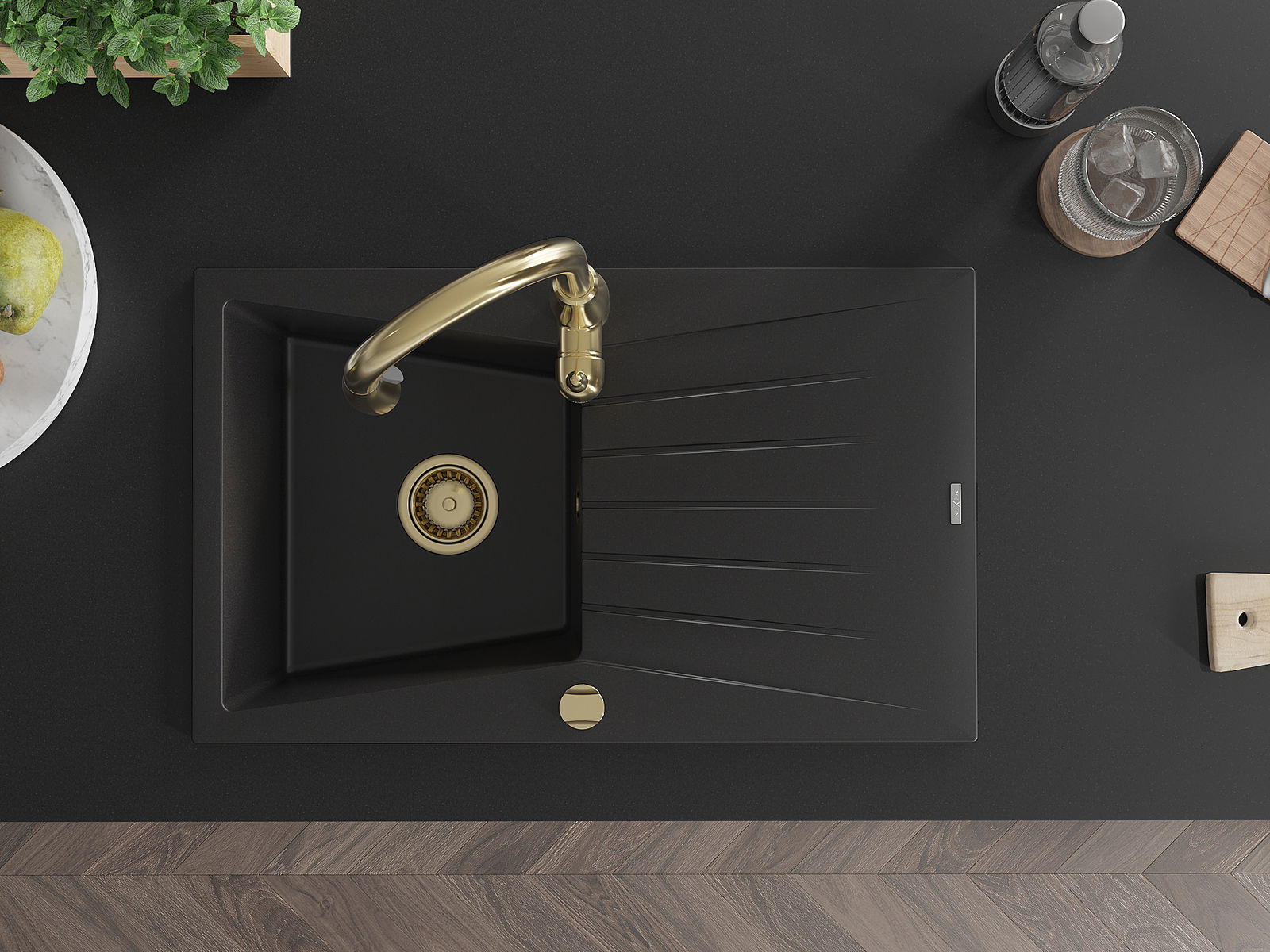 Mexen Cesar granitový dřez s 1 komorou, odkapávačem a kuchyňská baterie Savita, černá - 6514-77-672601-50
