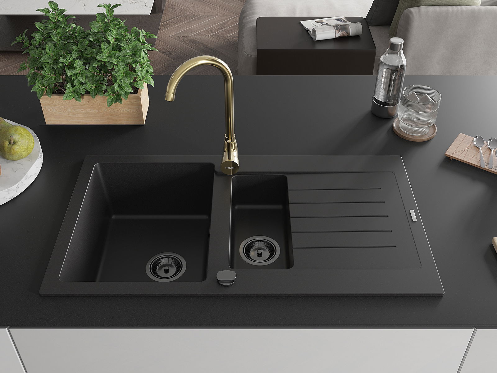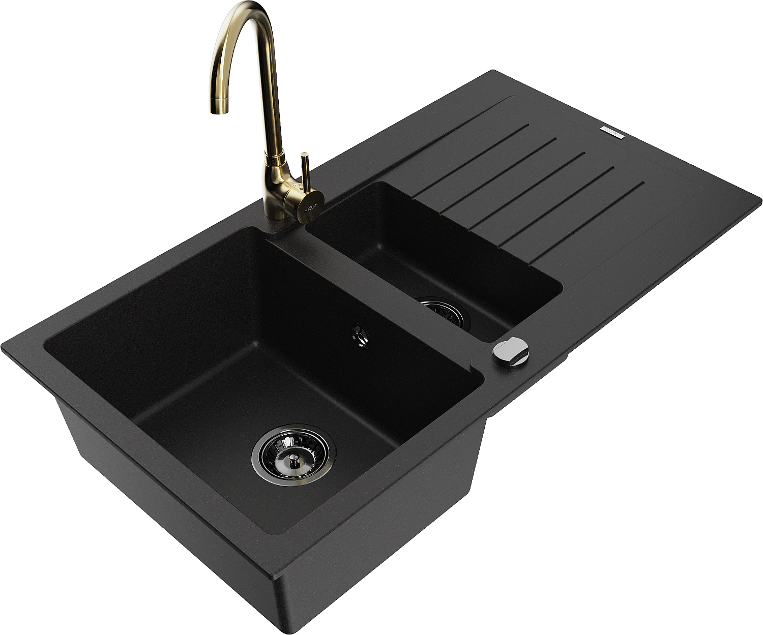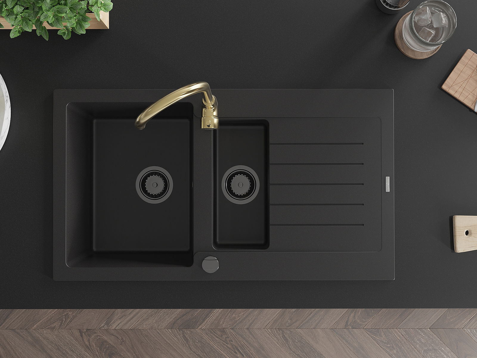 Mexen Matias granitový dřez 1,5-komorový s odkapávačem a kuchyňskou baterií Telma, černý - 6502-77-670200-50-B