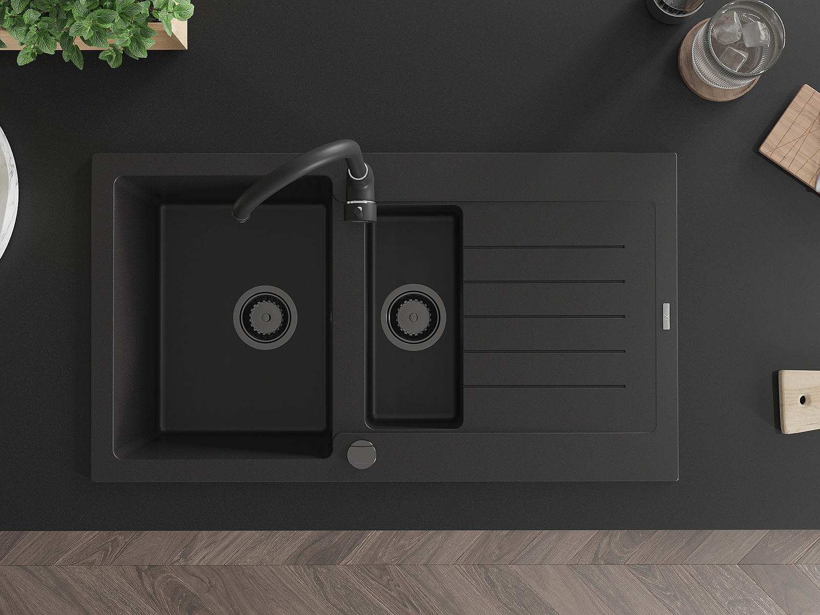 • Mexen Matias granitový dřez 1,5-komorový s odkapávačem a kuchyňskou baterií Telma, černý - 6502-77-670200-70-B