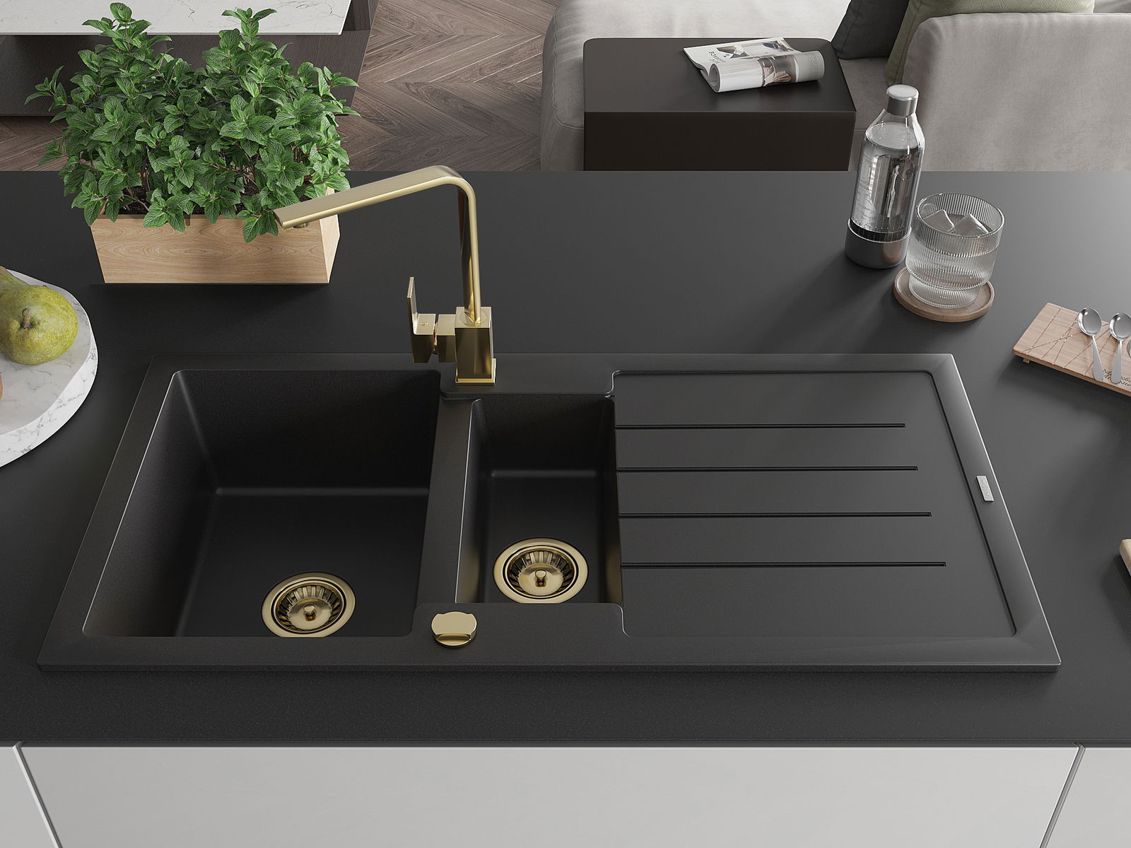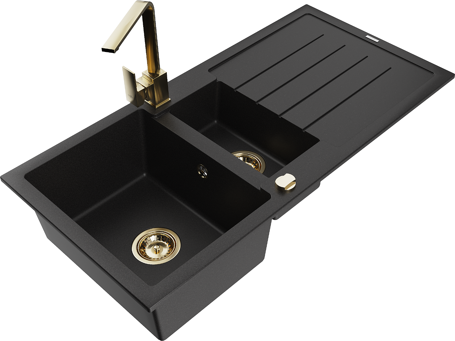Mexen Andres granitový dřez 1,5-komorový s odkapávačem a kuchyňskou baterií Rita, černý - 6515-77-670300-50