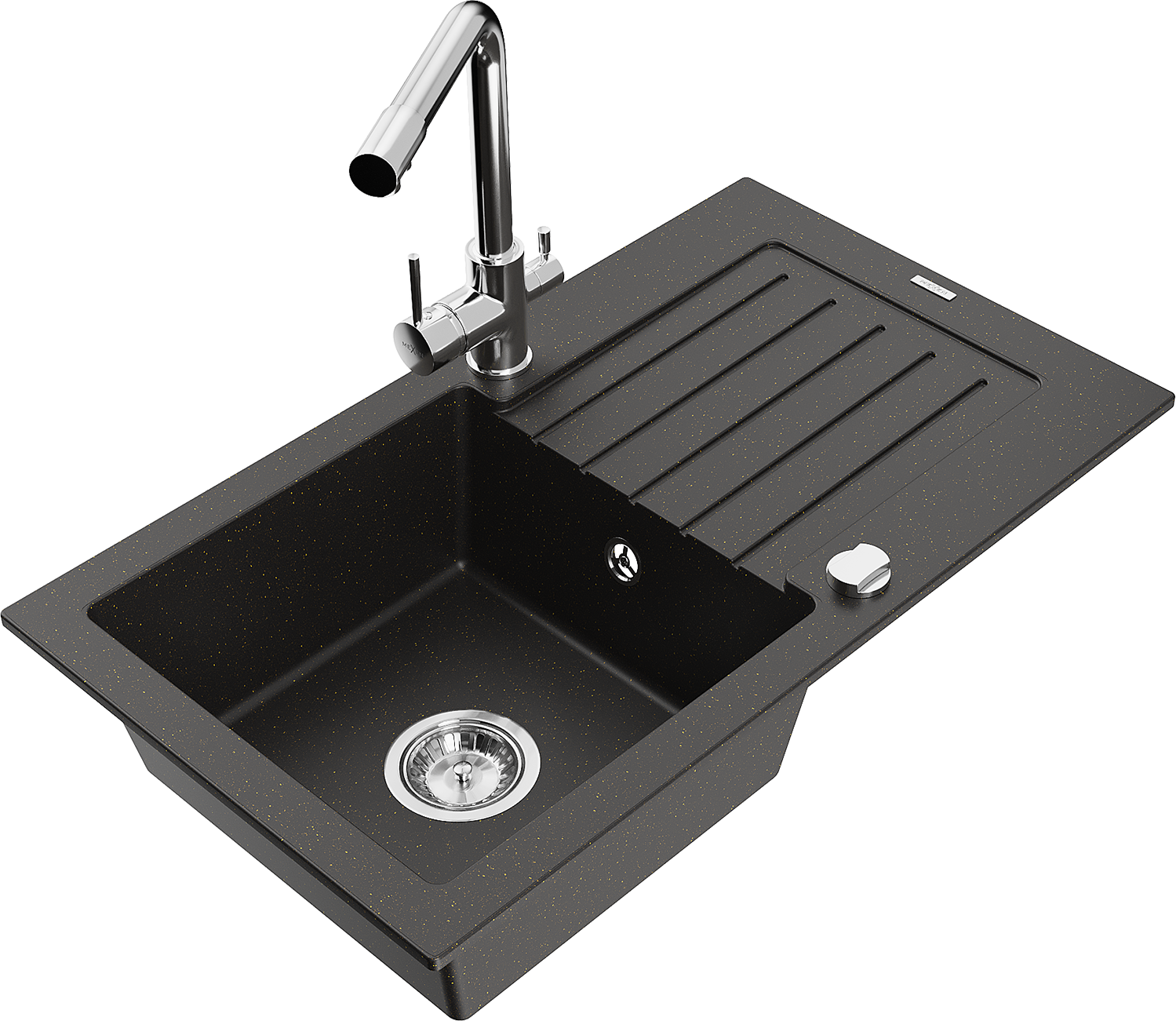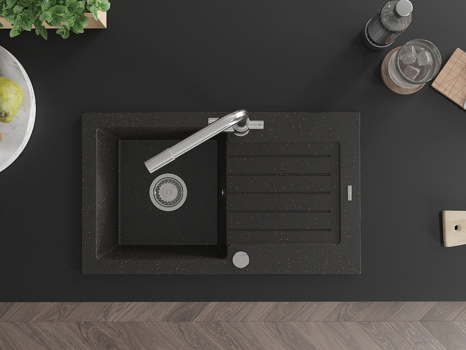 Mexen Pablo granitový dřez s 1 komorou, s odkapávačem a kuchyňskou baterií Duero, černý/zlatý metalik - 6510-75-671600-00