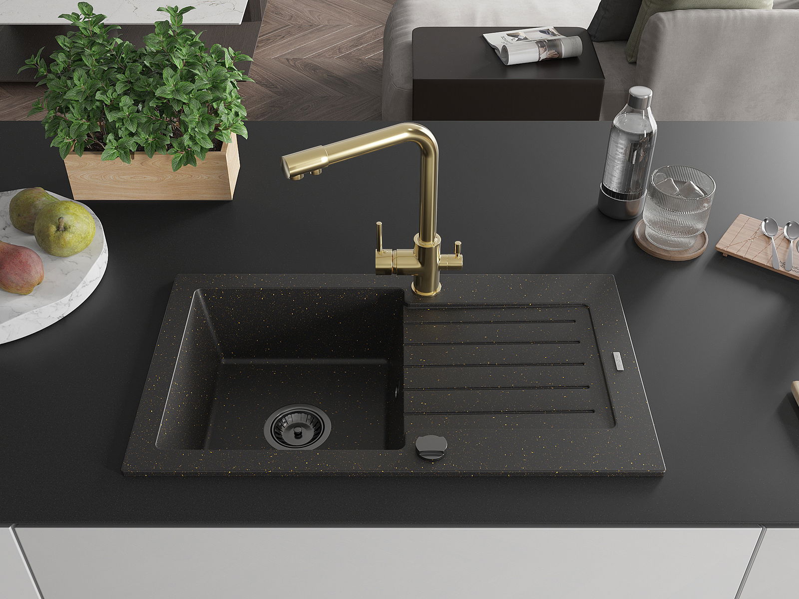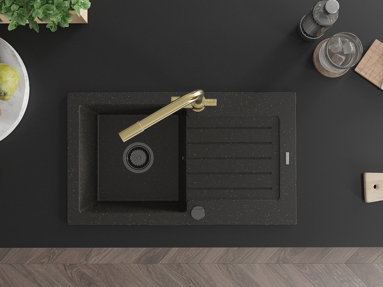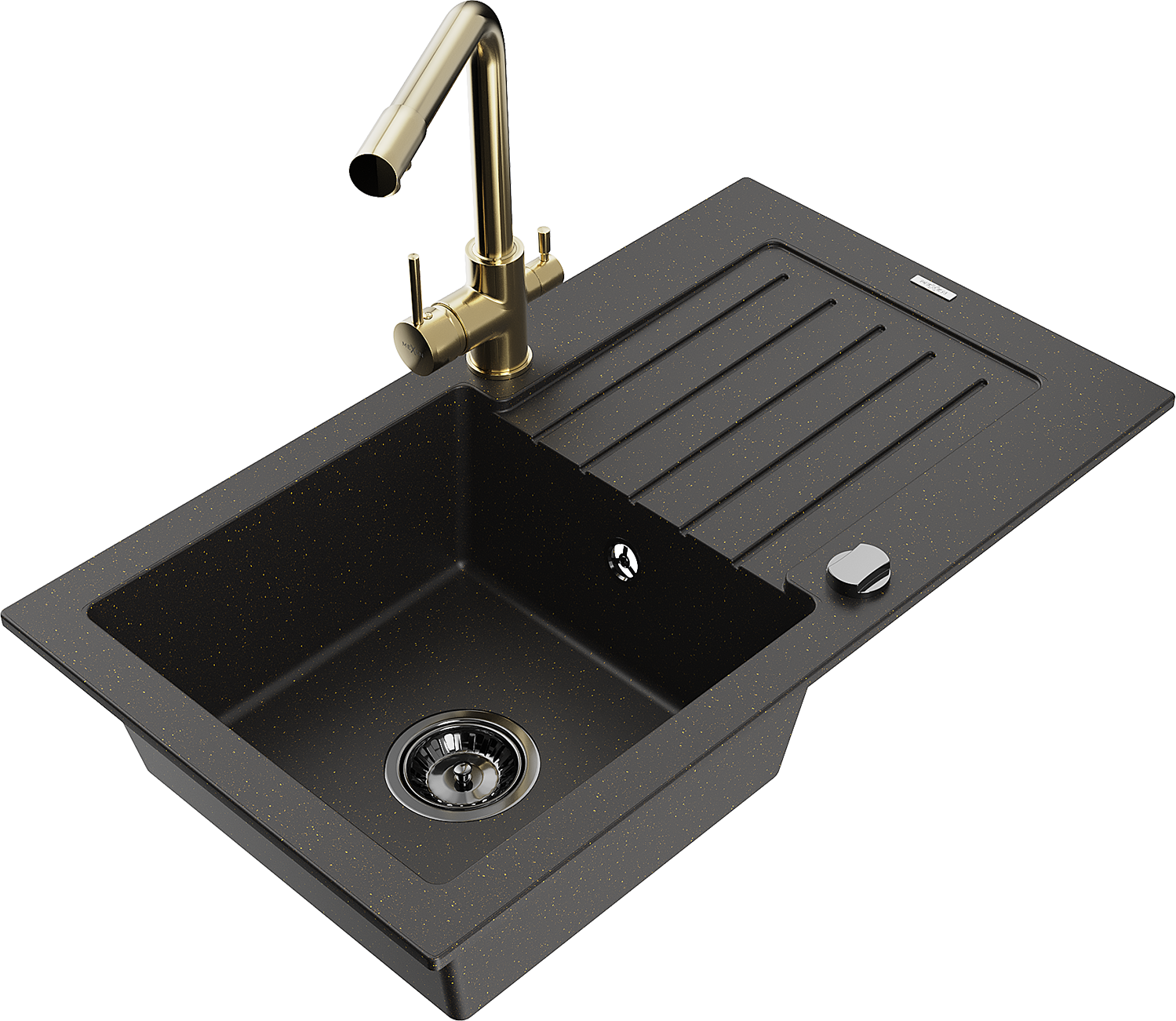 Mexen Pablo granitový dřez 1-komorový s odkapávačem a kuchyňskou baterií Duero, černý/zlatý metalik - 6510-75-671600-50-B