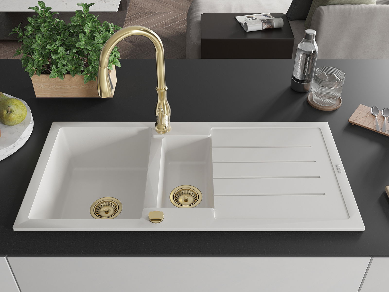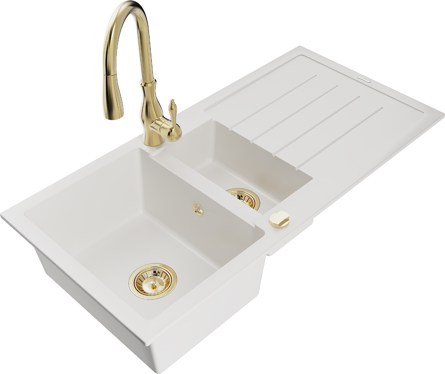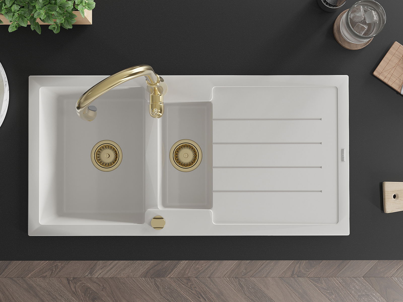 Mexen Andres granitový dřez 1,5-komorový s odkapávačem a kuchyňskou baterií Savita, bílý - 6515-20-672601-50