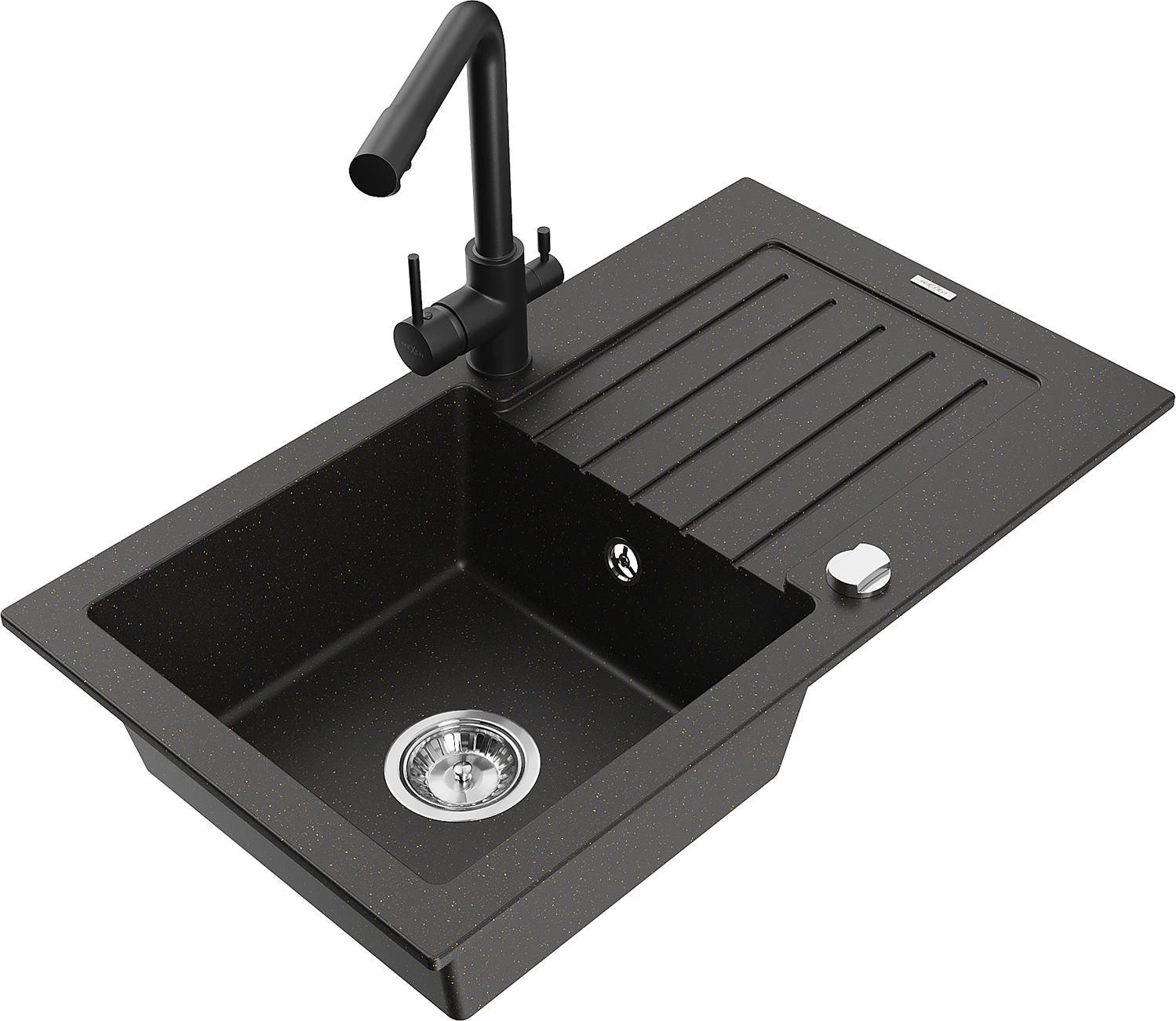 Mexen Pablo granitový dřez s 1 komorou, odkapávačem a kuchyňskou baterií Duero, černý/zlatý metalický - 6510-75-671600-70