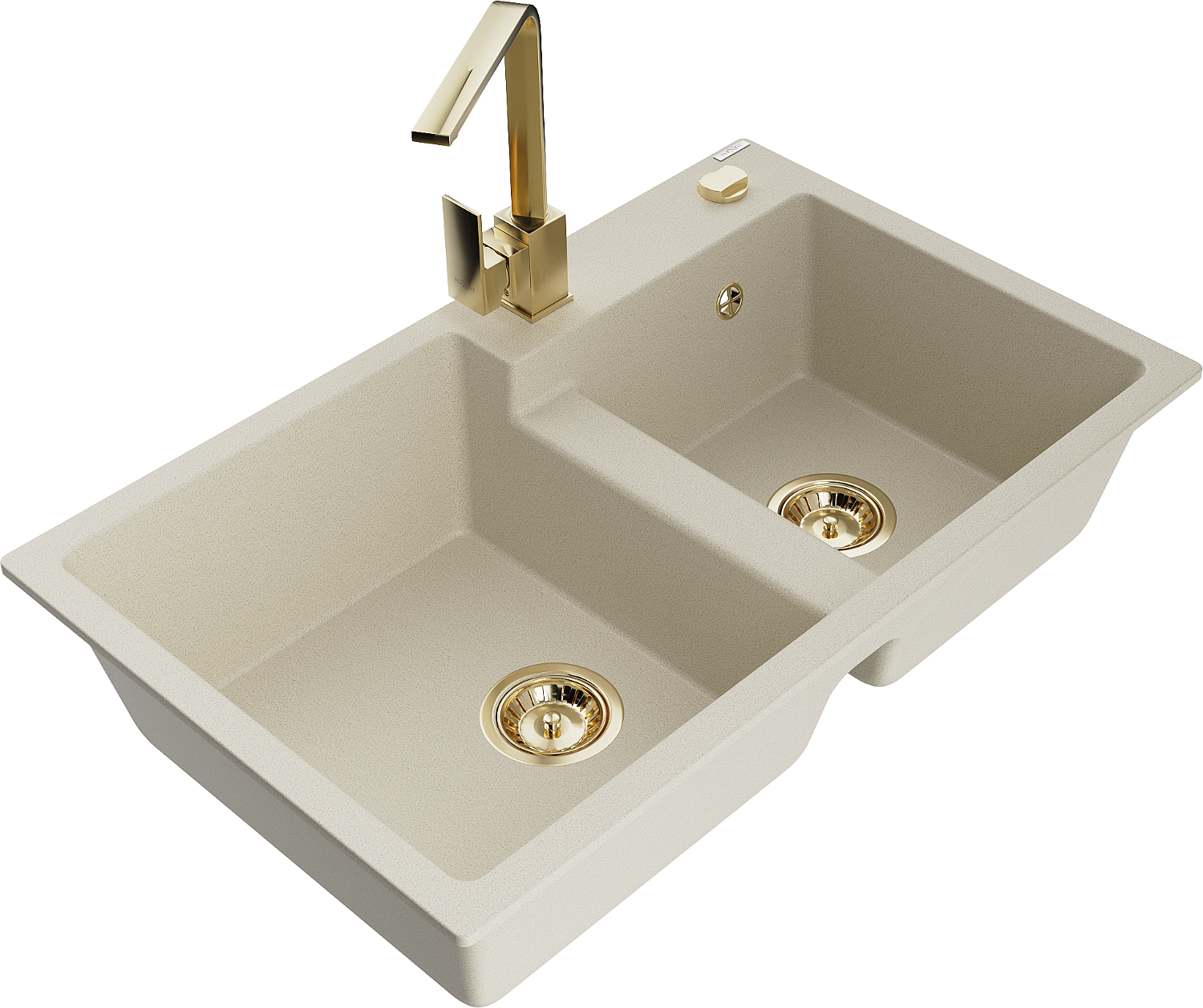 Mexen Tomas, dvoukomorový granitový dřez s kuchyňskou baterií Rita, béžový - 6516-69-670300-50
