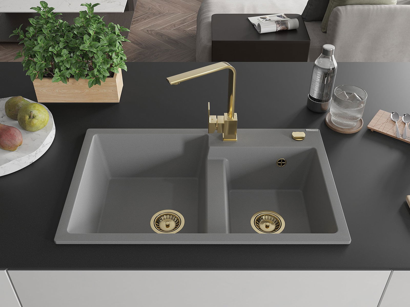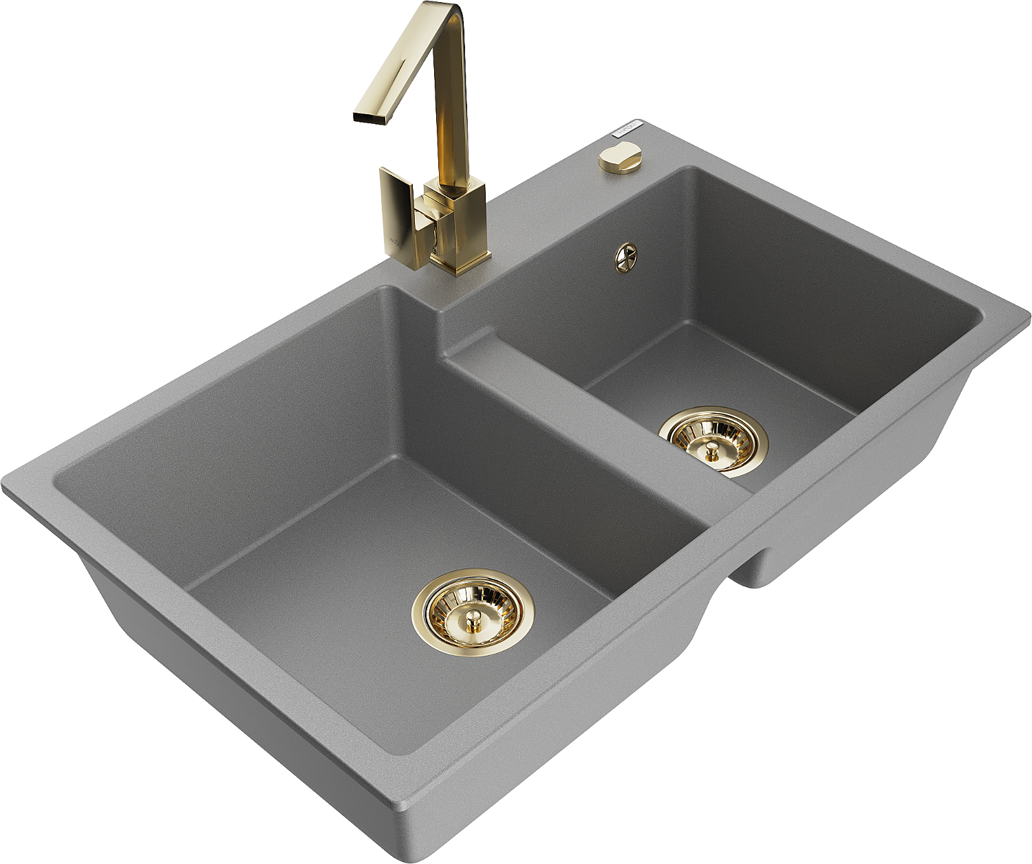 Mexen Tomas granitový dřez 2-komorový s kuchyňskou baterií Rita, šedý - 6516-71-670300-50