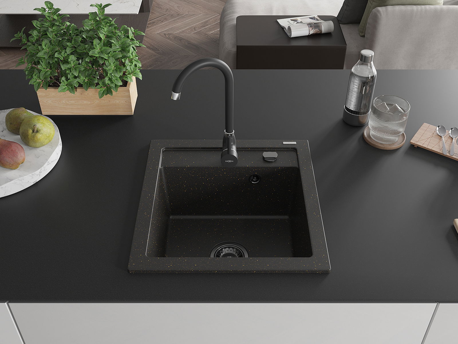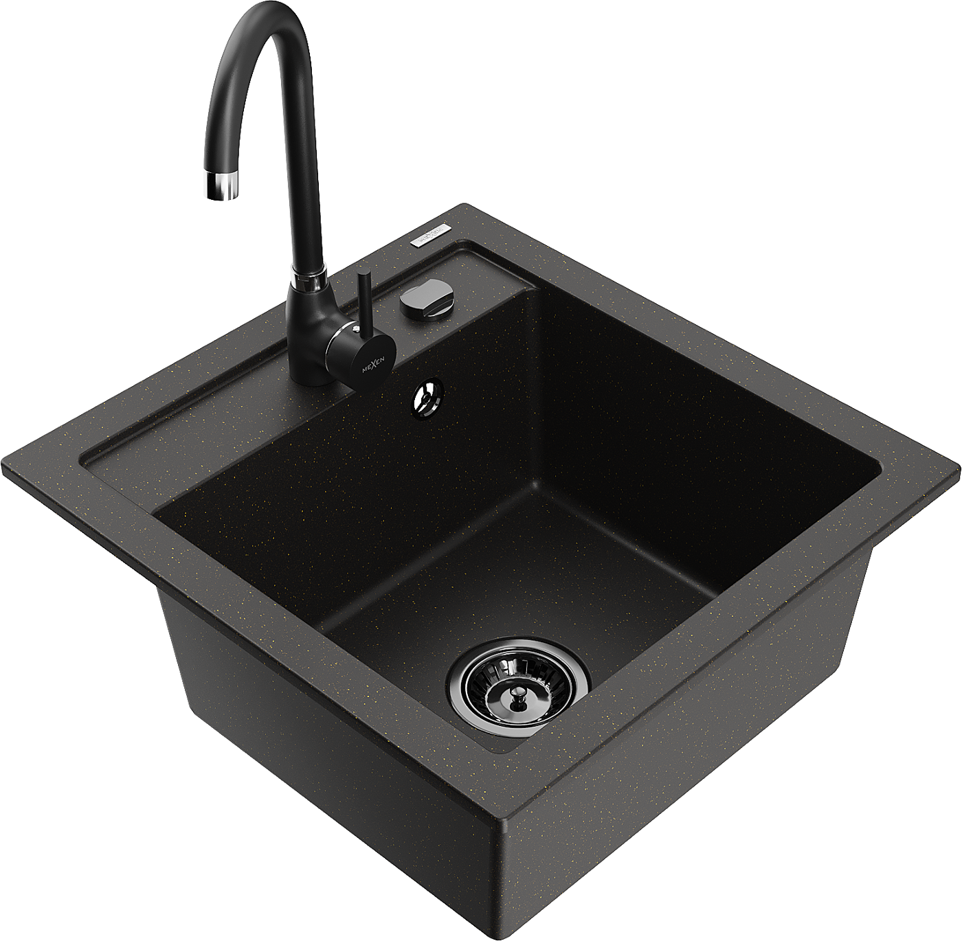 Mexen Vito granitový dřez 1-komorový s kuchyňskou baterií Telma, černý/zlatý metalický - 6503-75-670200-70-B