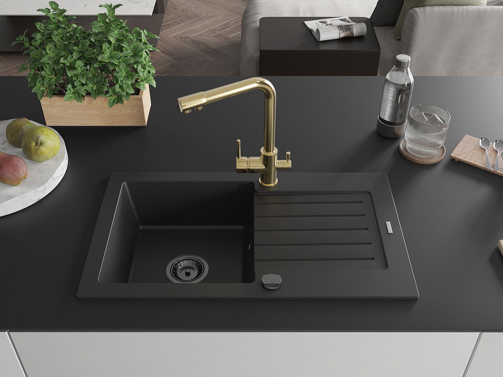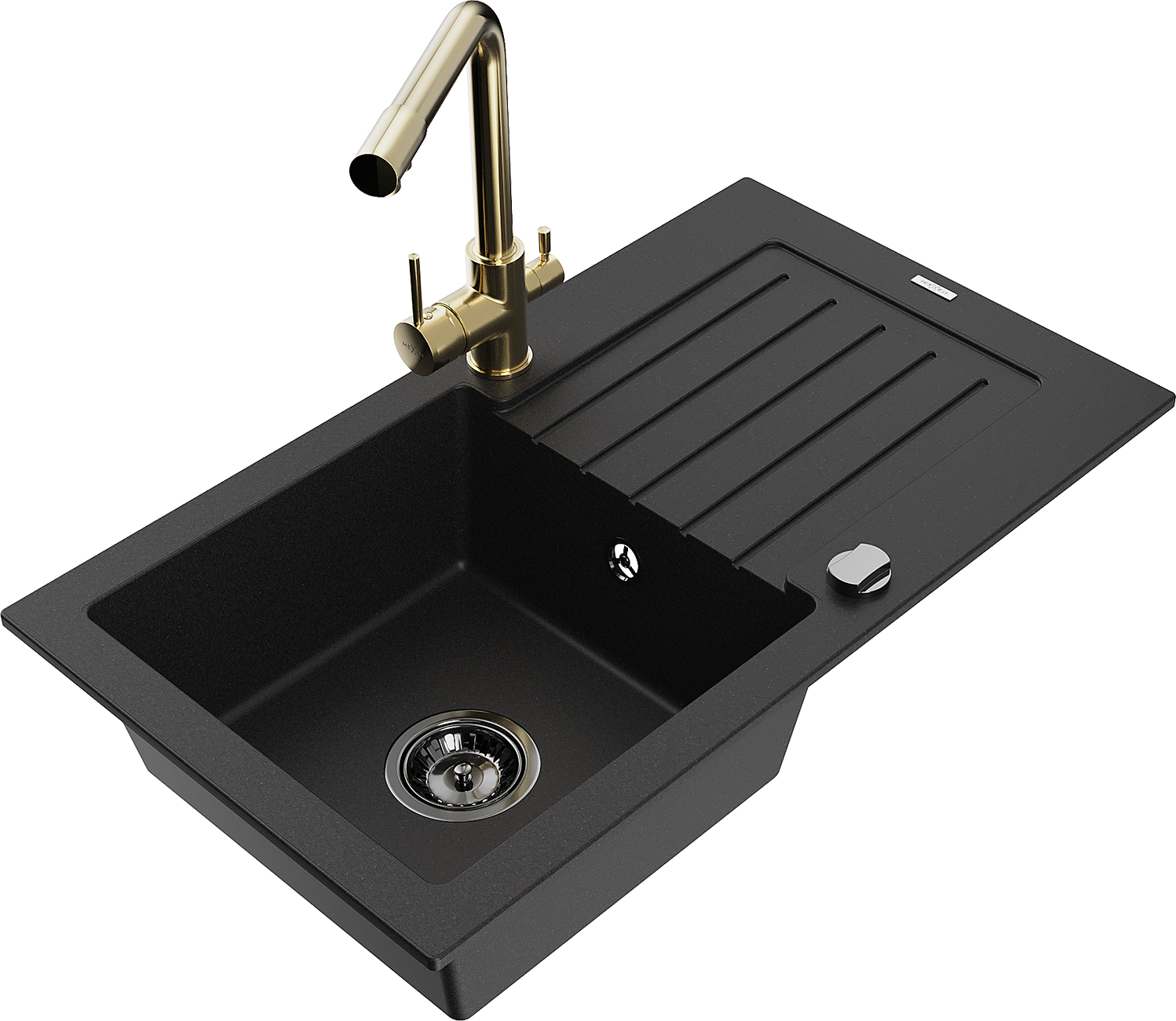 Mexen Pablo žulový kuchyňský dřez s jednou komorou a odkapávačem a kuchyňskou baterií Duero, černý - 6510-77-671600-50-B
