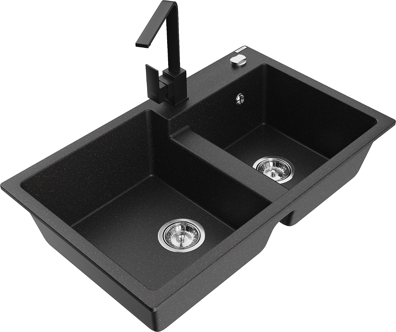 Mexen Tomas dvoukomorový granitový dřez s kuchyňskou baterií Rita, černý/stříbrný metalík - 6516-73-670300-70
