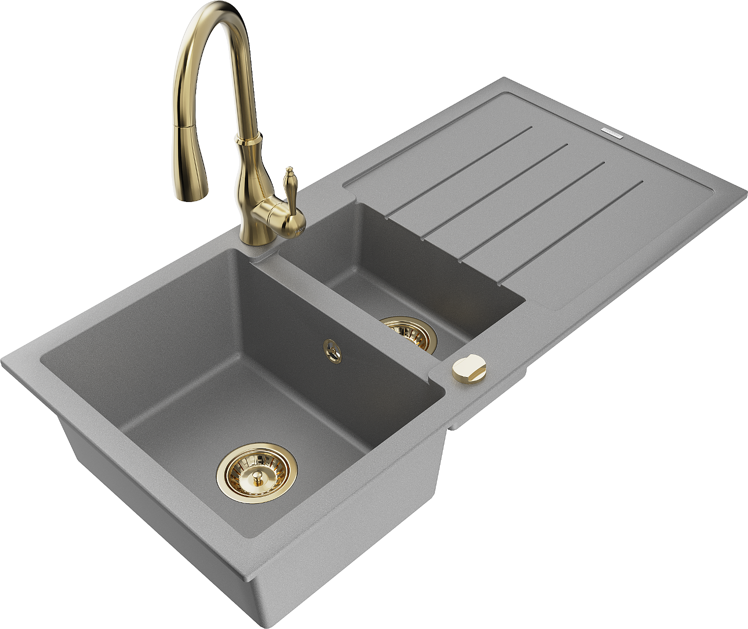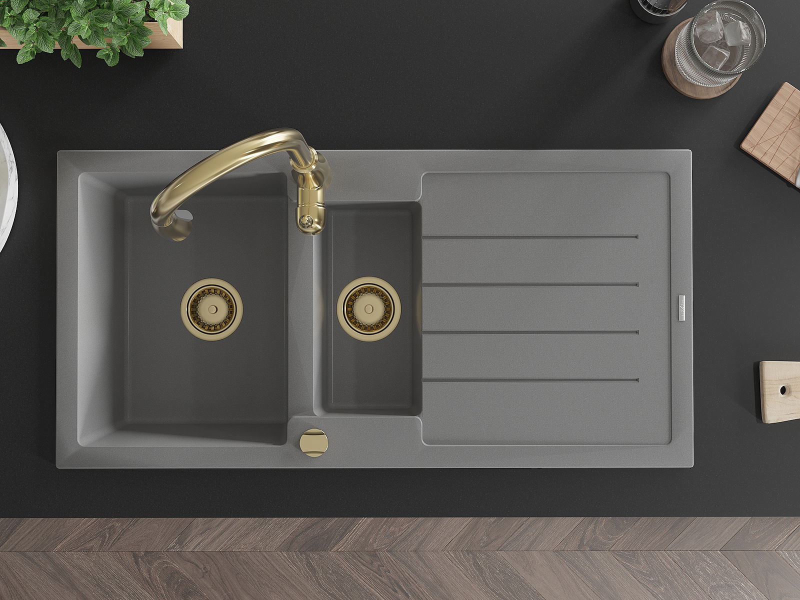 Mexen Andres žulový dřez 1,5-komorový s odkapávačem a kuchyňskou baterií Savita, šedý - 6515-71-672601-50