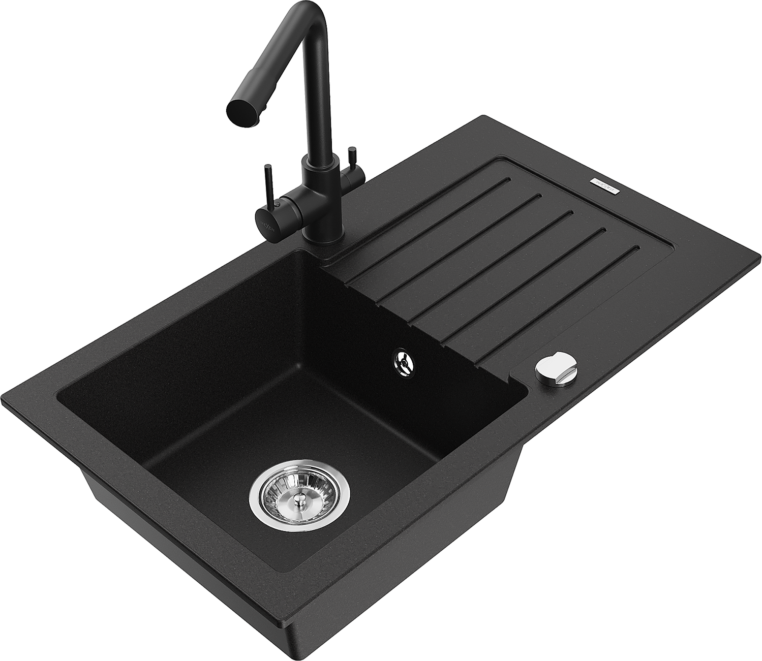 Mexen Pablo jednokomorový granitový dřez s odkapávačem a kuchyňskou baterií Duero, černý - 6510-77-671600-70