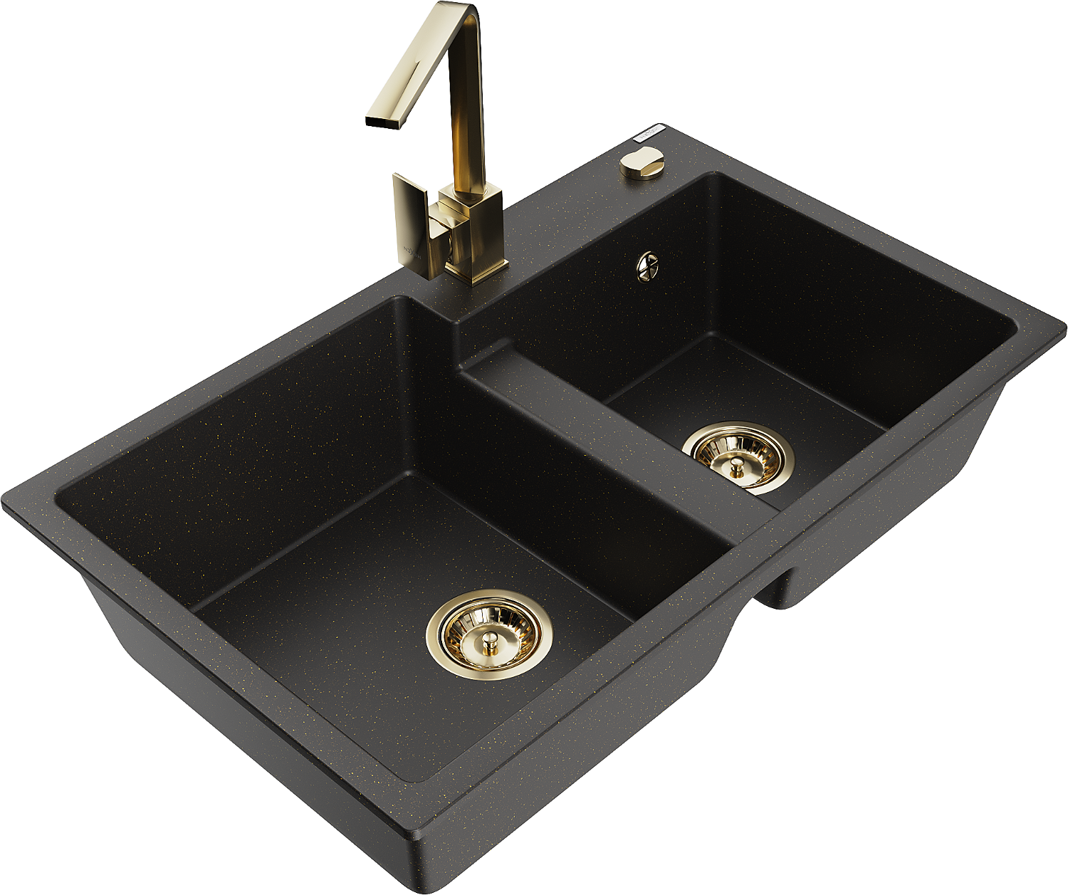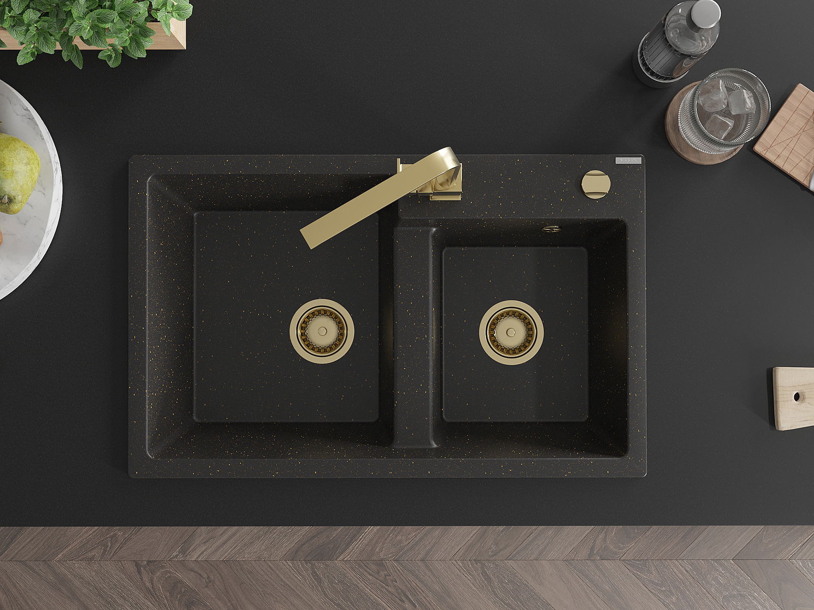 Mexen Tomas granitový dřez 2-komorový s kuchyňskou baterií Rita, černý/zlatý metalik - 6516-75-670300-50
