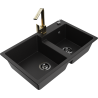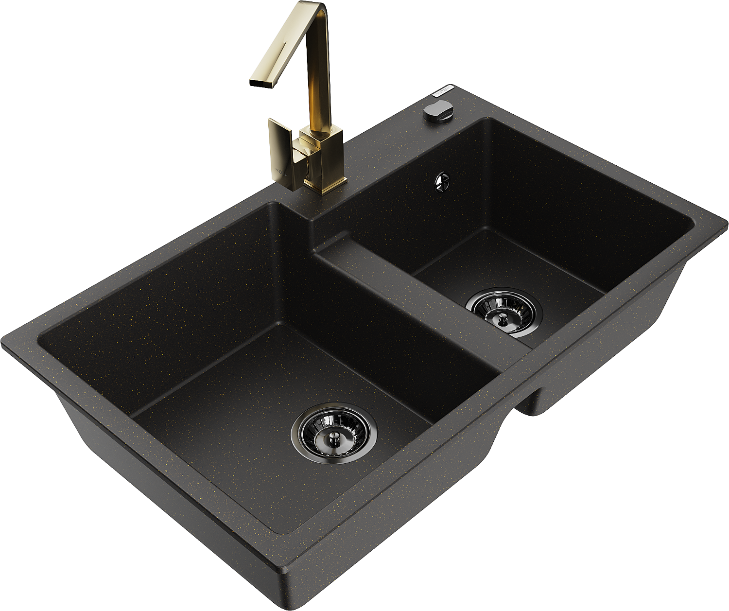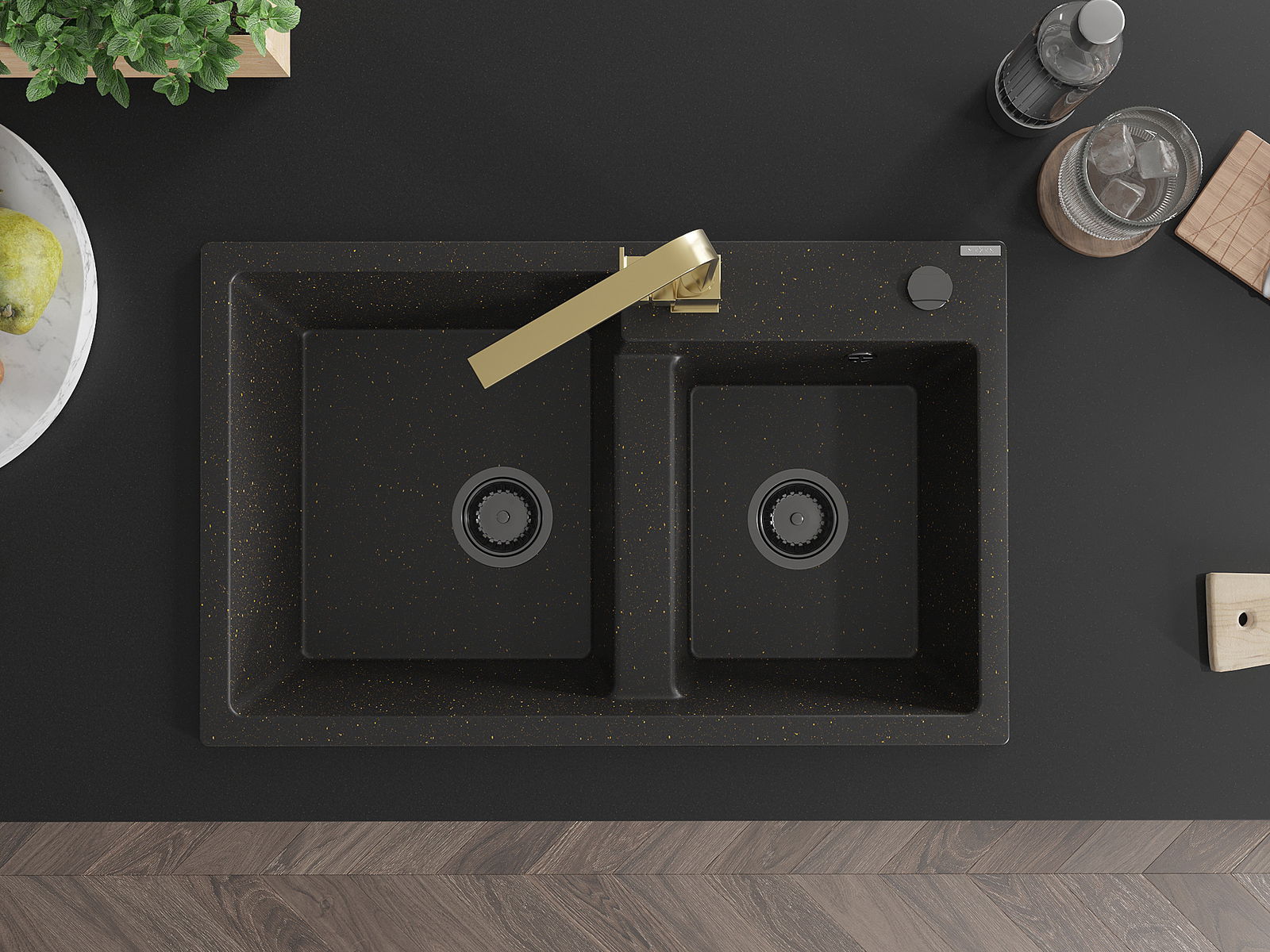 Mexen Tomas granitový dřez 2-komorový s kuchyňskou baterií Rita, černý/zlatý metalik - 6516-75-670300-50-B