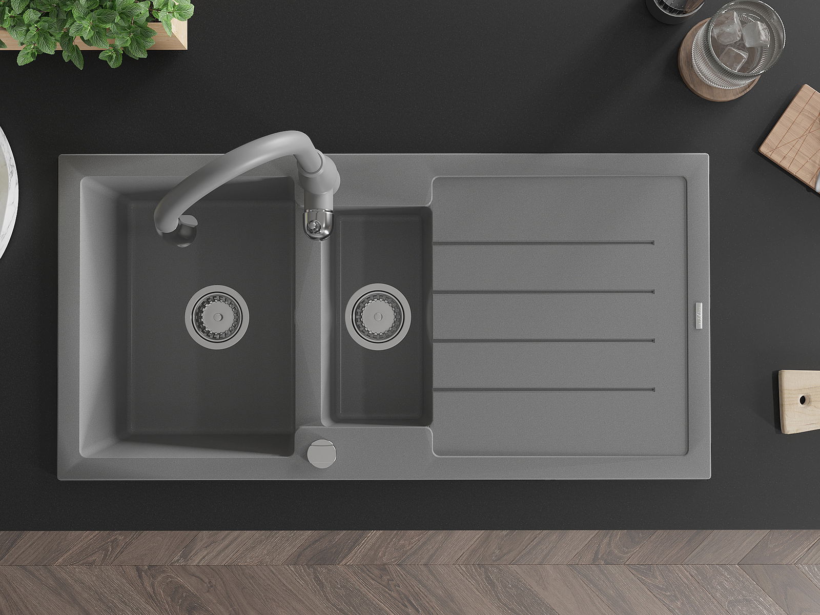 Mexen Andres dřez žulový 1,5-komorový s odkapávačem a kuchyňskou baterií Savita, šedý - 6515-71-672601-71