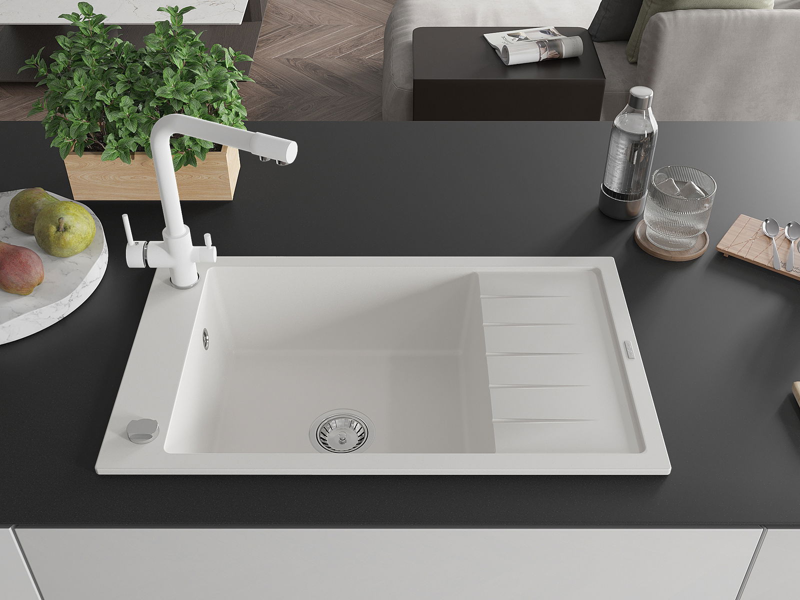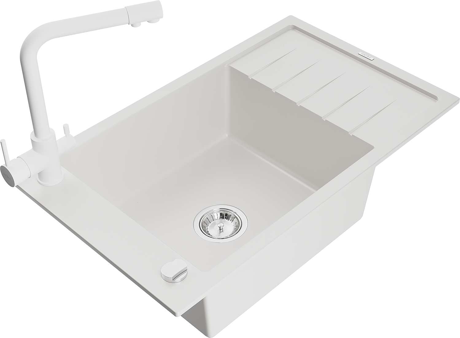 Mexen Elias granitový dřez s 1 komorou, odkapávačem a kuchyňskou baterií Duero, bílý - 6511-20-671600-20