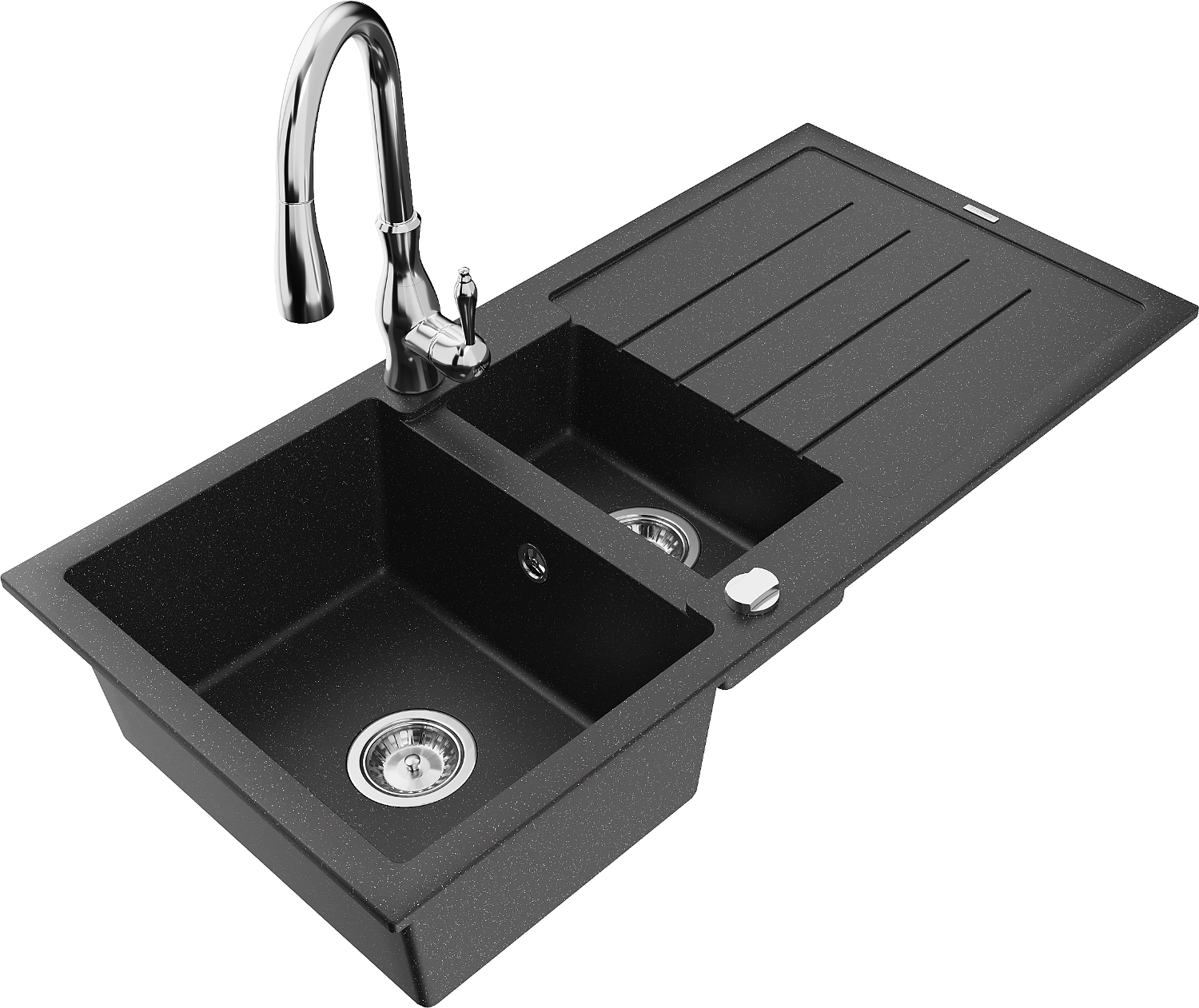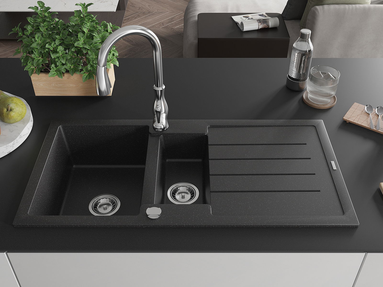 Mexen Andres žulový dřez 1,5-komorový s odkapávačem a kuchyňskou baterií Savita, černý/stříbrný - 6515-73-672601-00