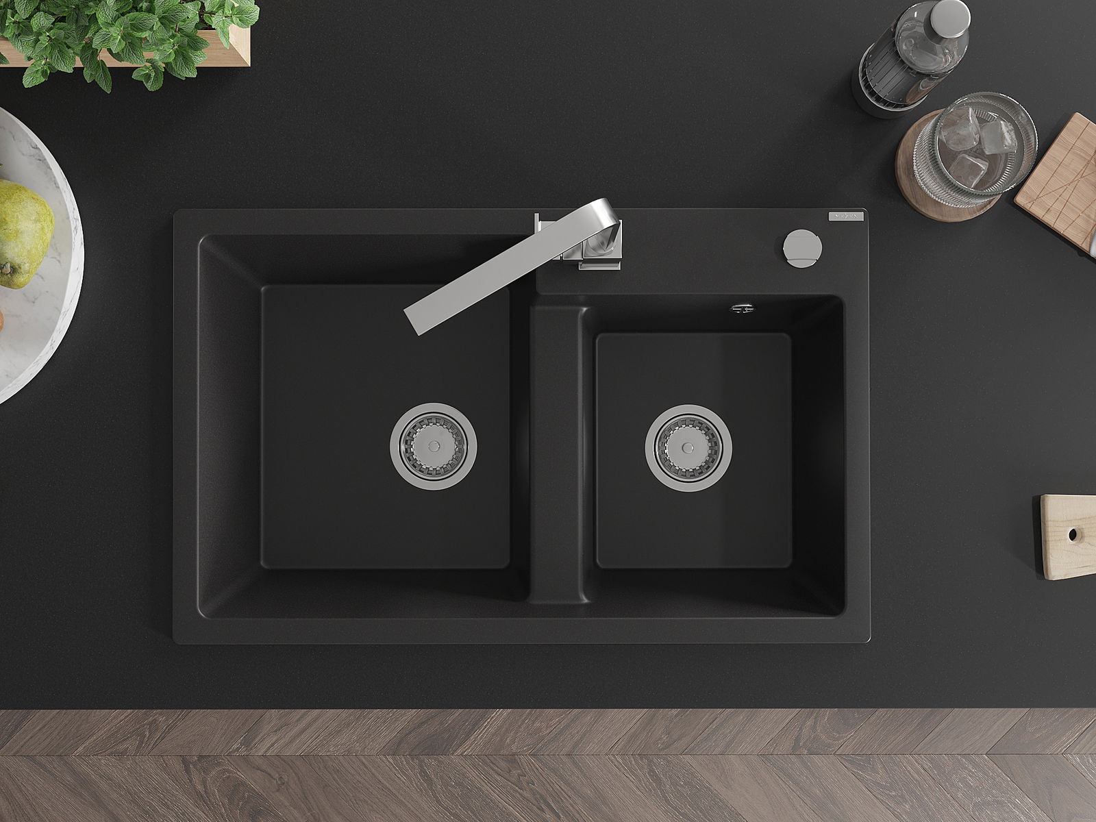 Dřez má předfrézovaný otvor o průměru 35 mm k samostatnému proražení. Může být použit například k montáži dávkovače na tekutinu, který eliminuje přítomnost plastových lahví v kuchyni a dodá jí elegantní finiš.