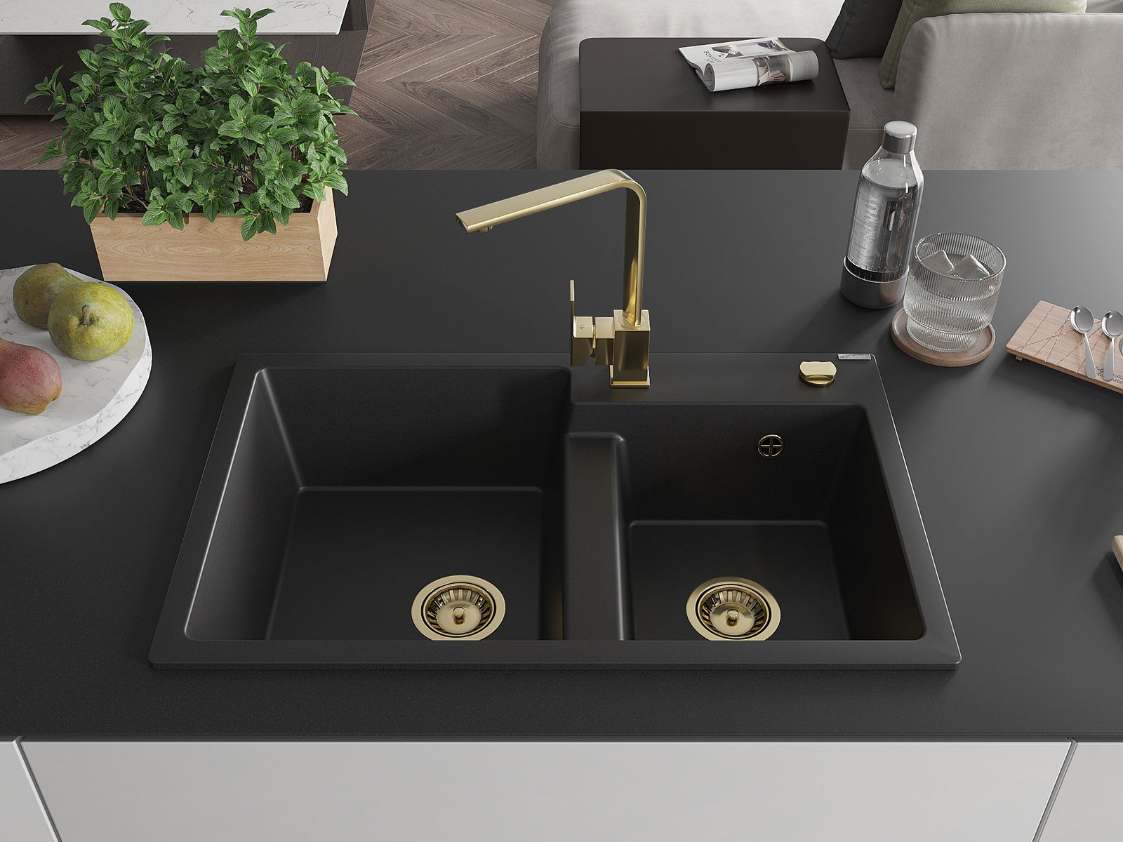 Dřez má předfrézovaný otvor o průměru 35 mm k samostatnému proražení. Může být použit například k montáži dávkovače na tekutinu, který eliminuje přítomnost plastových lahví v kuchyni a dodá jí elegantní finiš.