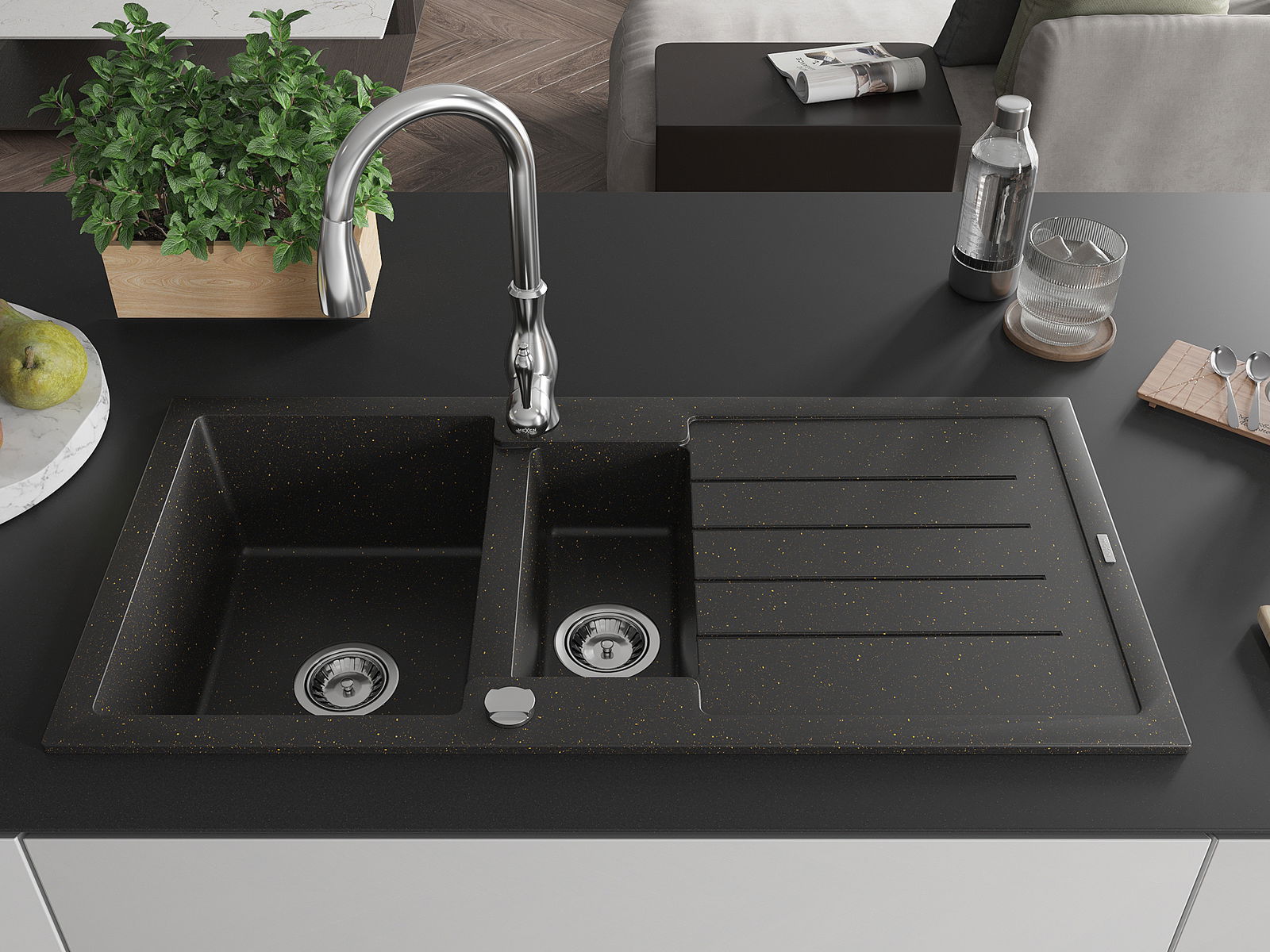Mexen Andres granitový dřez 1,5-komorový s odkapávačem a kuchyňskou baterií Savita, černý/zlatý metalický- 6515-75-672601-00