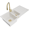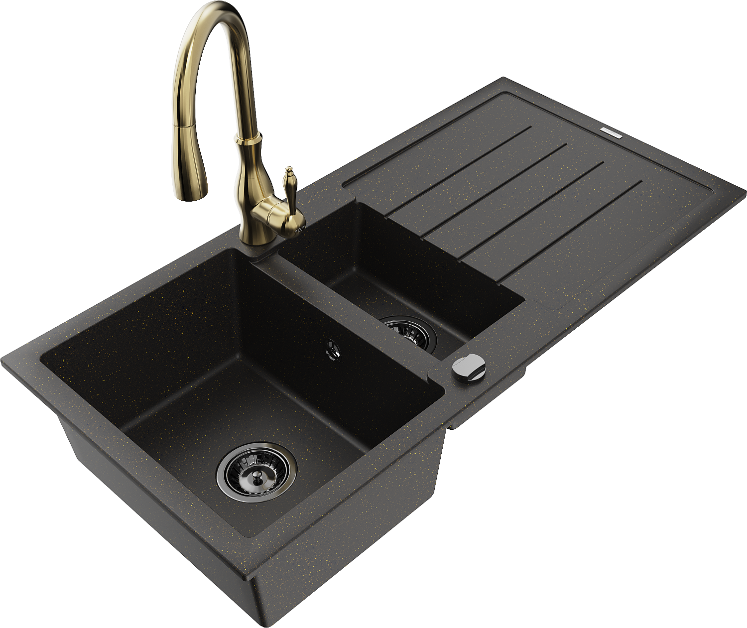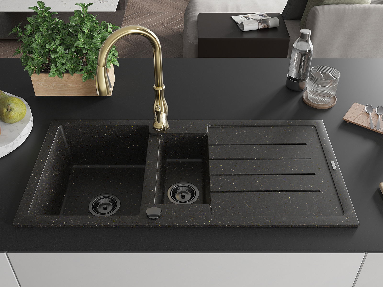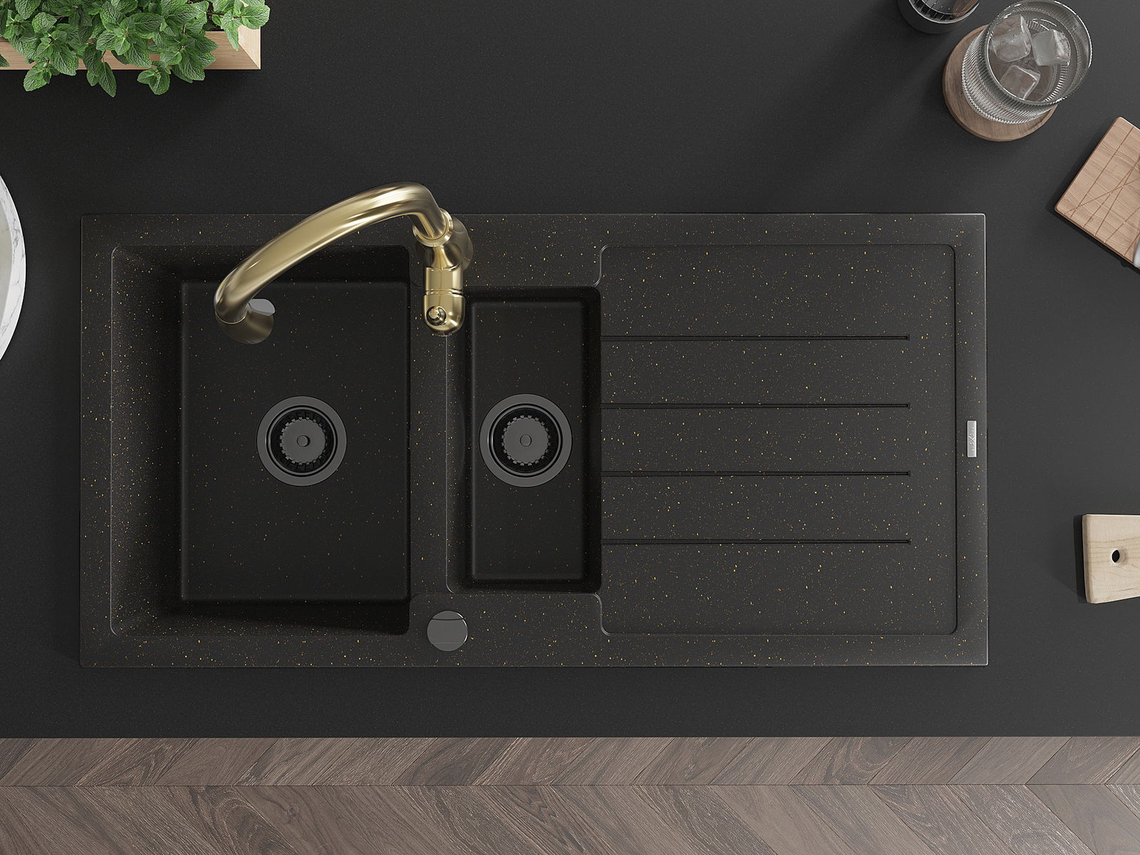 Mexen Andres granitový dřez 1,5-komorový s odkapávačem a kuchyňskou baterií Savita, černý/zlatý - 6515-75-672601-50-B