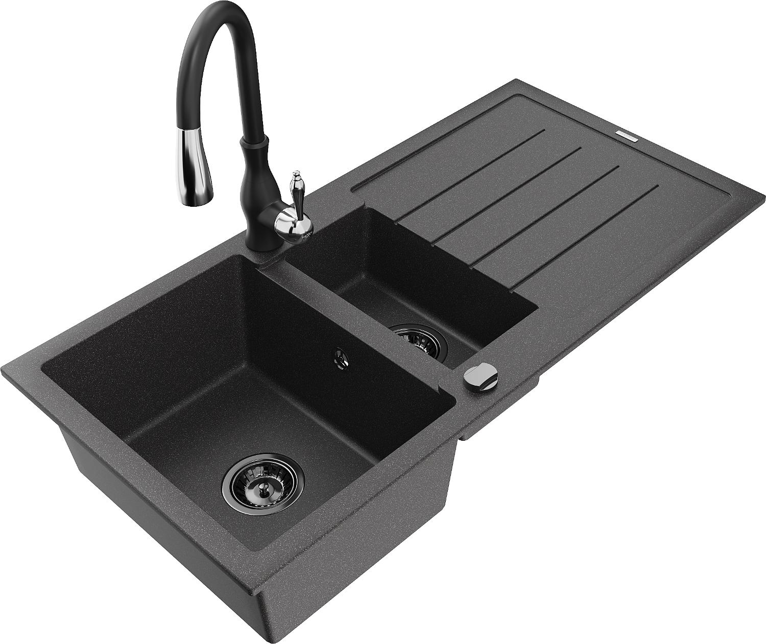 Mexen Andres granitový dřez 1,5-komorový s odkapávačem a kuchyňskou baterií Savita, černý skvrnitý - 6515-76-672601-70-B