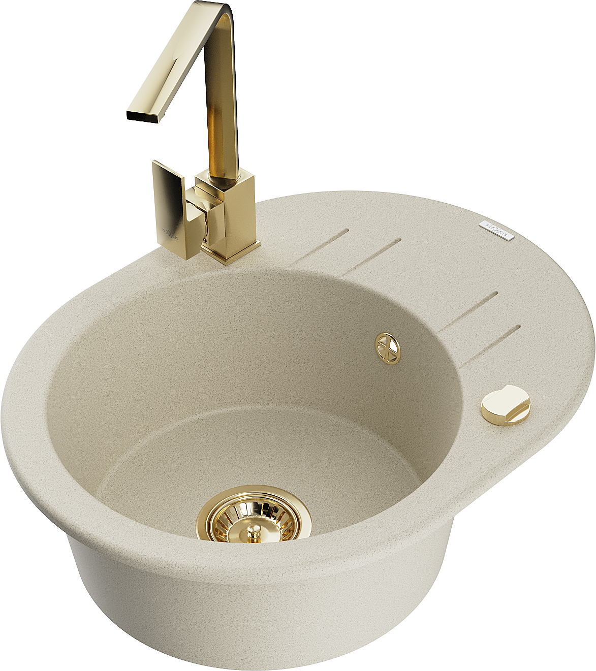 Mexen Kevin granitový dřez 1-komorový s odkapávačem a kuchyňskou baterií Rita, béžový - 6517-69-670300-50
