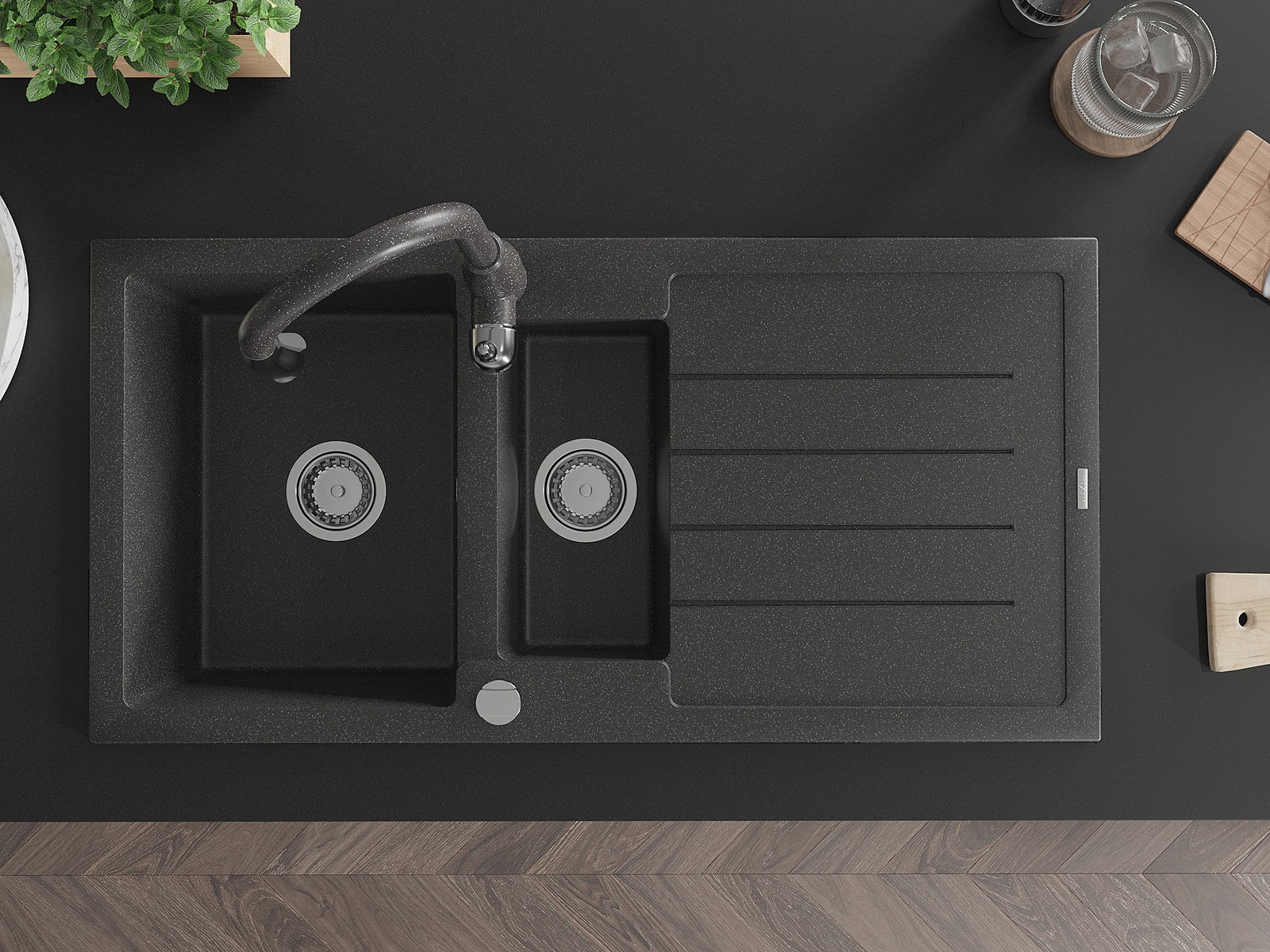 Mexen Andres žulový dřez 1,5-komorový s odkapávačem a kuchyňskou baterií Savita, černý skvrnitý - 6515-76-672601-76