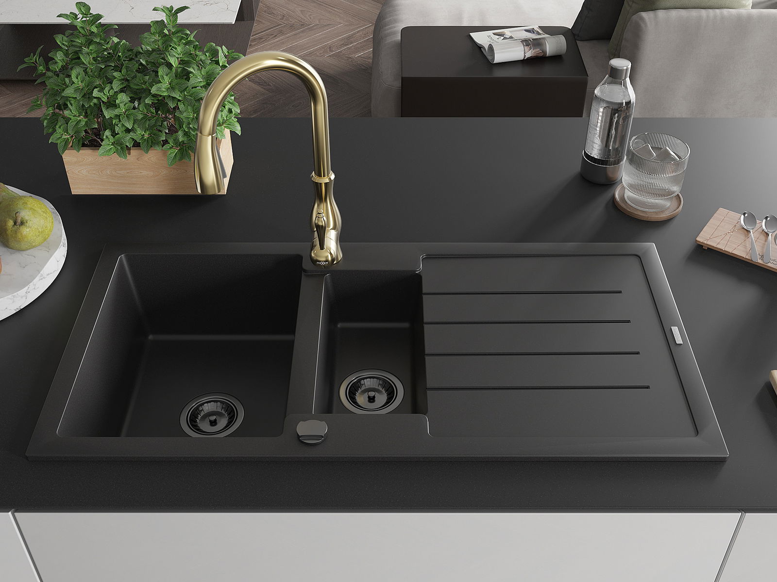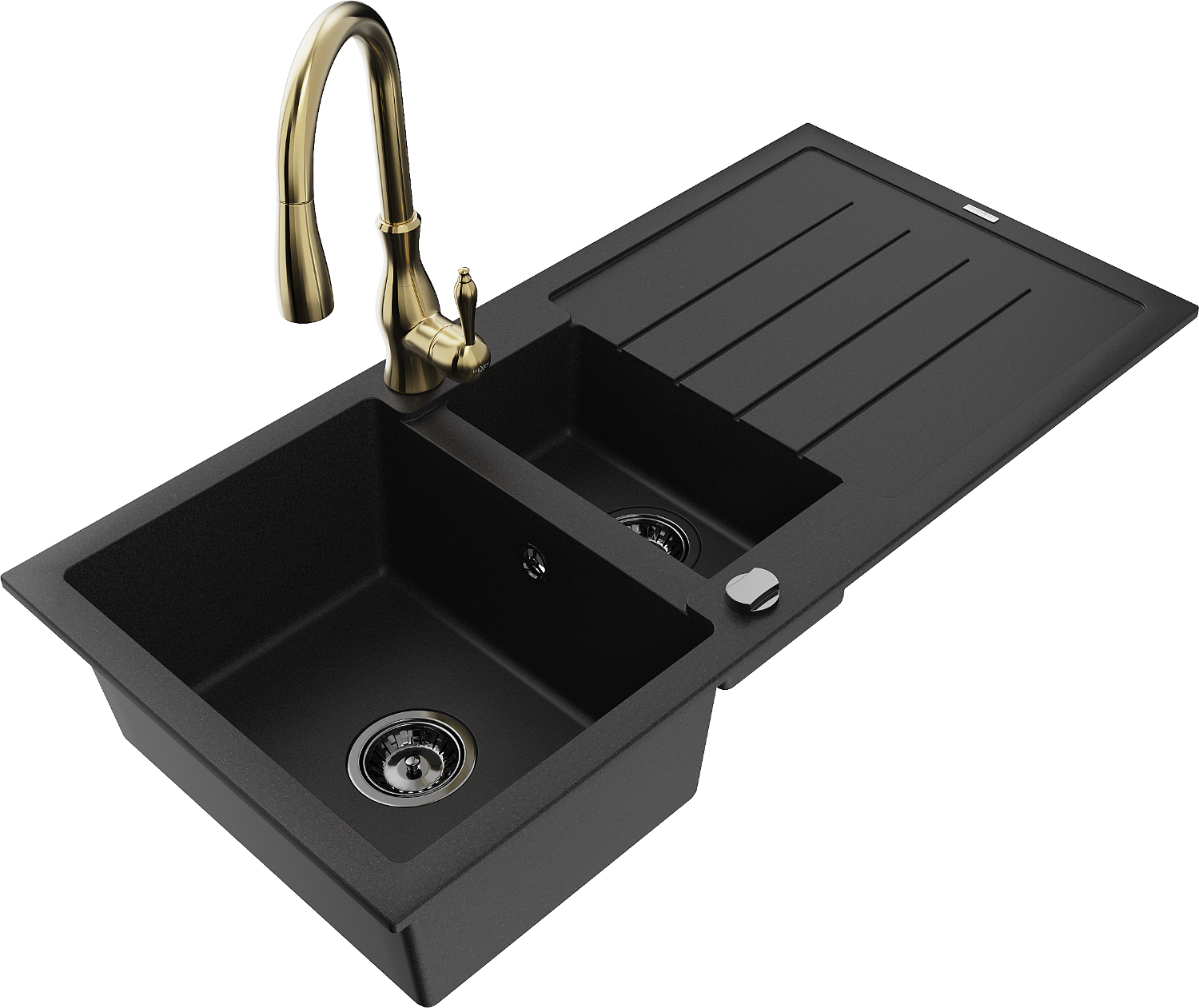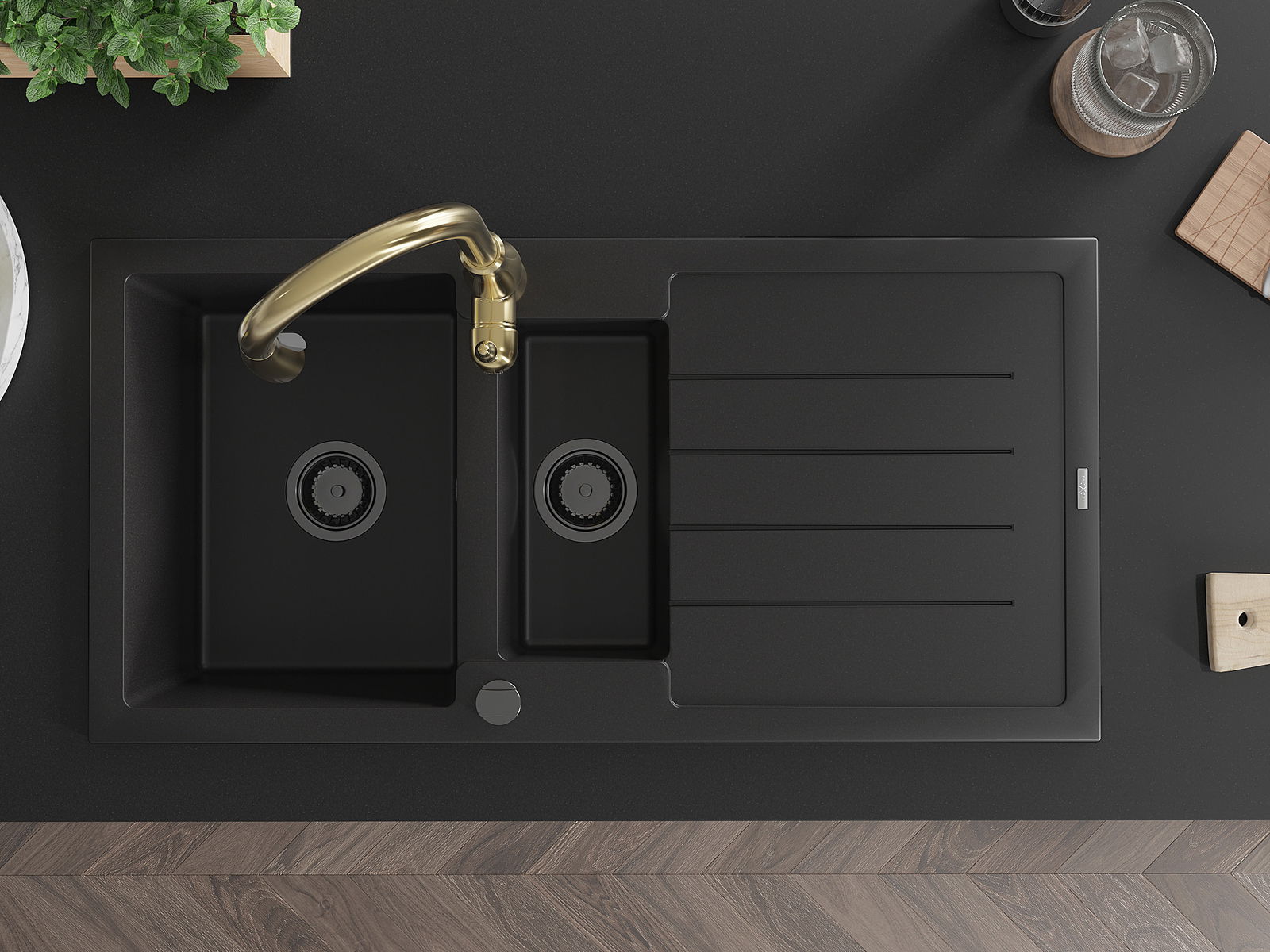Mexen Andres granitový dřez 1,5-komorový s odkapávačem a kuchyňská baterie Savita, černý - 6515-77-672601-50-B