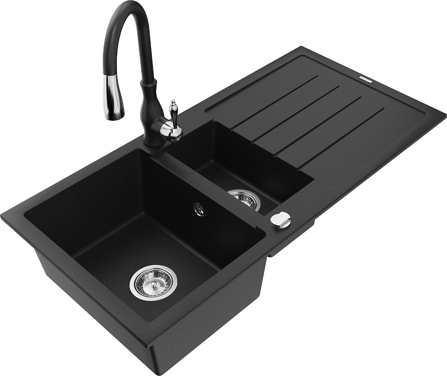 Mexen Andres žulový dřez 1,5-komorový s odkapávačem a kuchyňskou baterií Savita, černý - 6515-77-672601-70