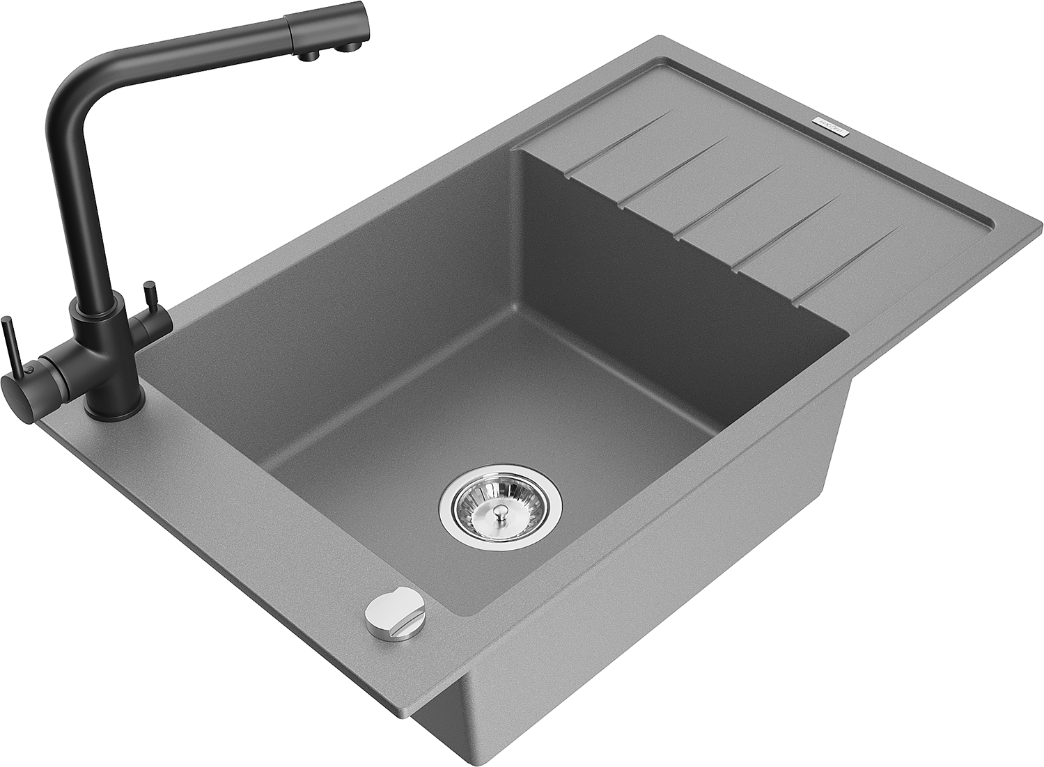 Mexen Elias granitový kuchyňský dřez 1-komorový s odkapávačem a kuchyňskou baterií Duero, šedý - 6511-71-671600-70
