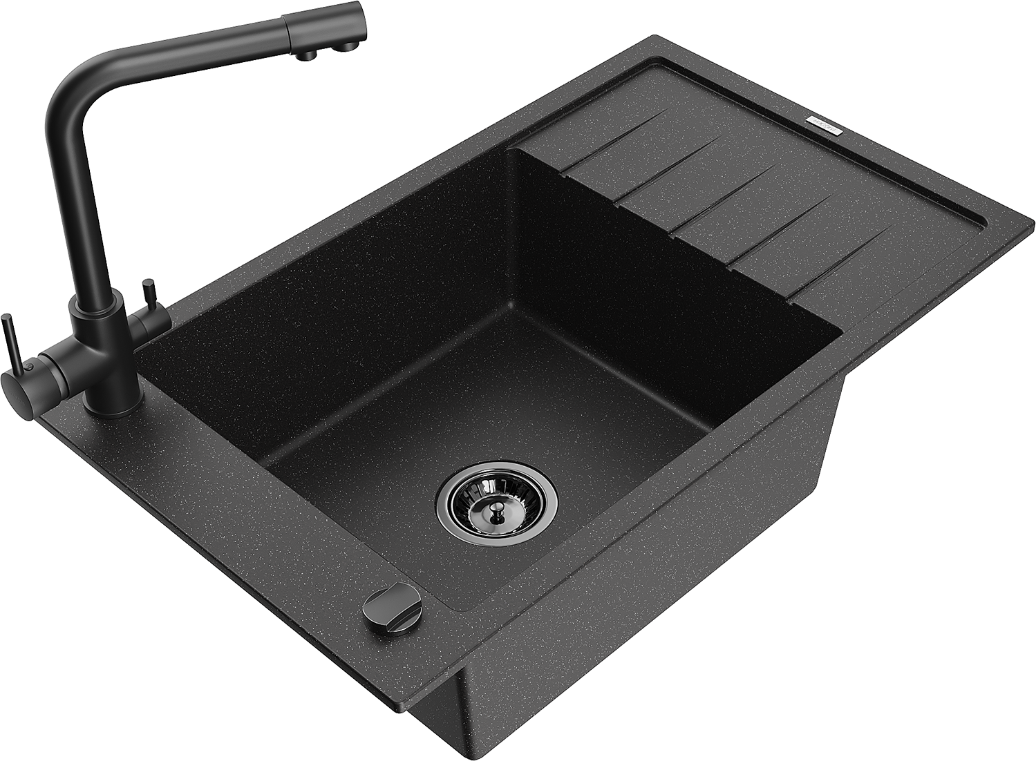 Mexen Elias granitový dřez 1-komorový s odkapávačem a dřezovou baterií Duero, černý/stříbrný metalik - 6511-73-671600-70-B