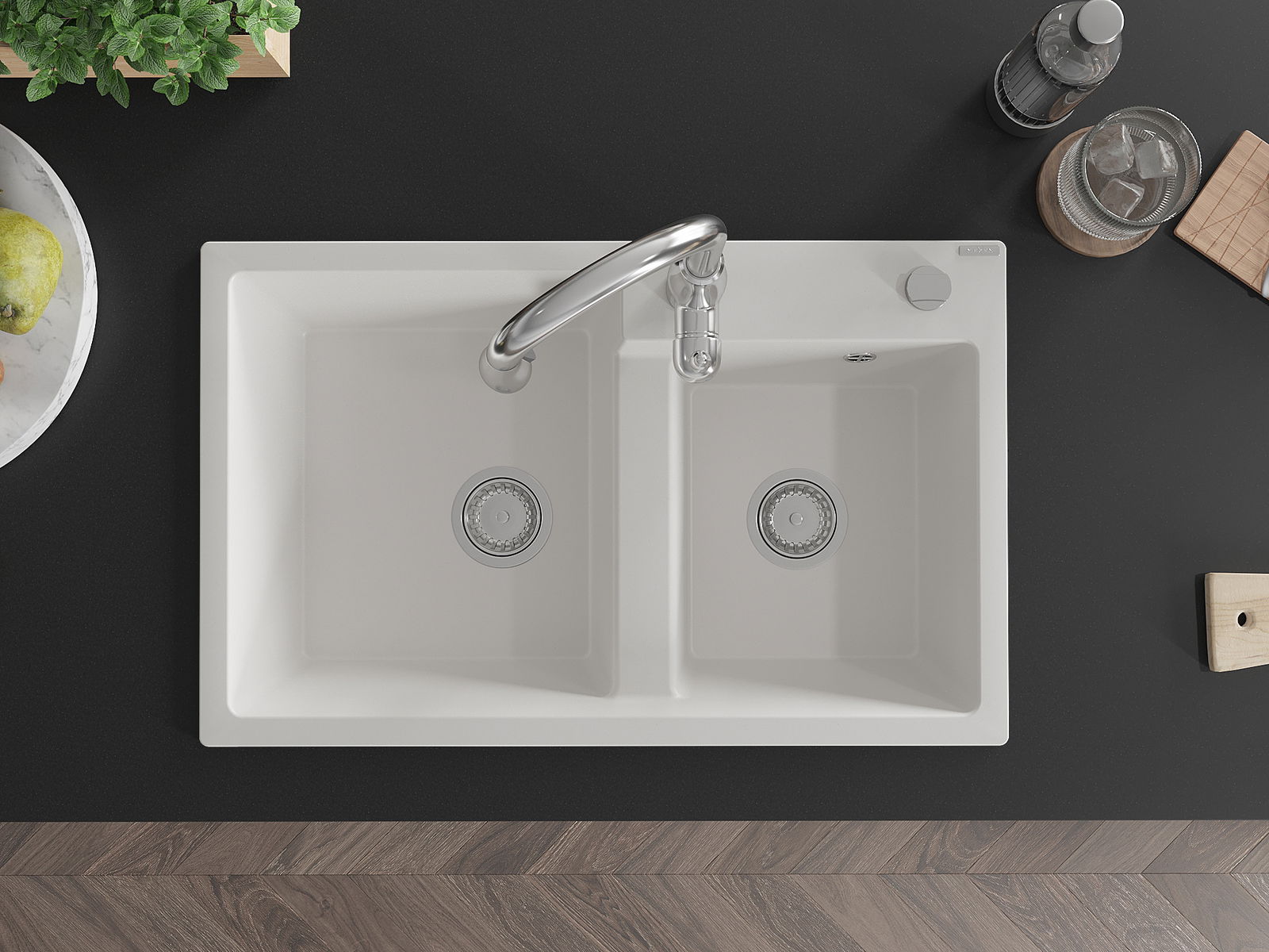 Mexen Tomas dvoukomorový granitový dřez s kuchyňskou baterií Savita, bílý - 6516-20-672601-00