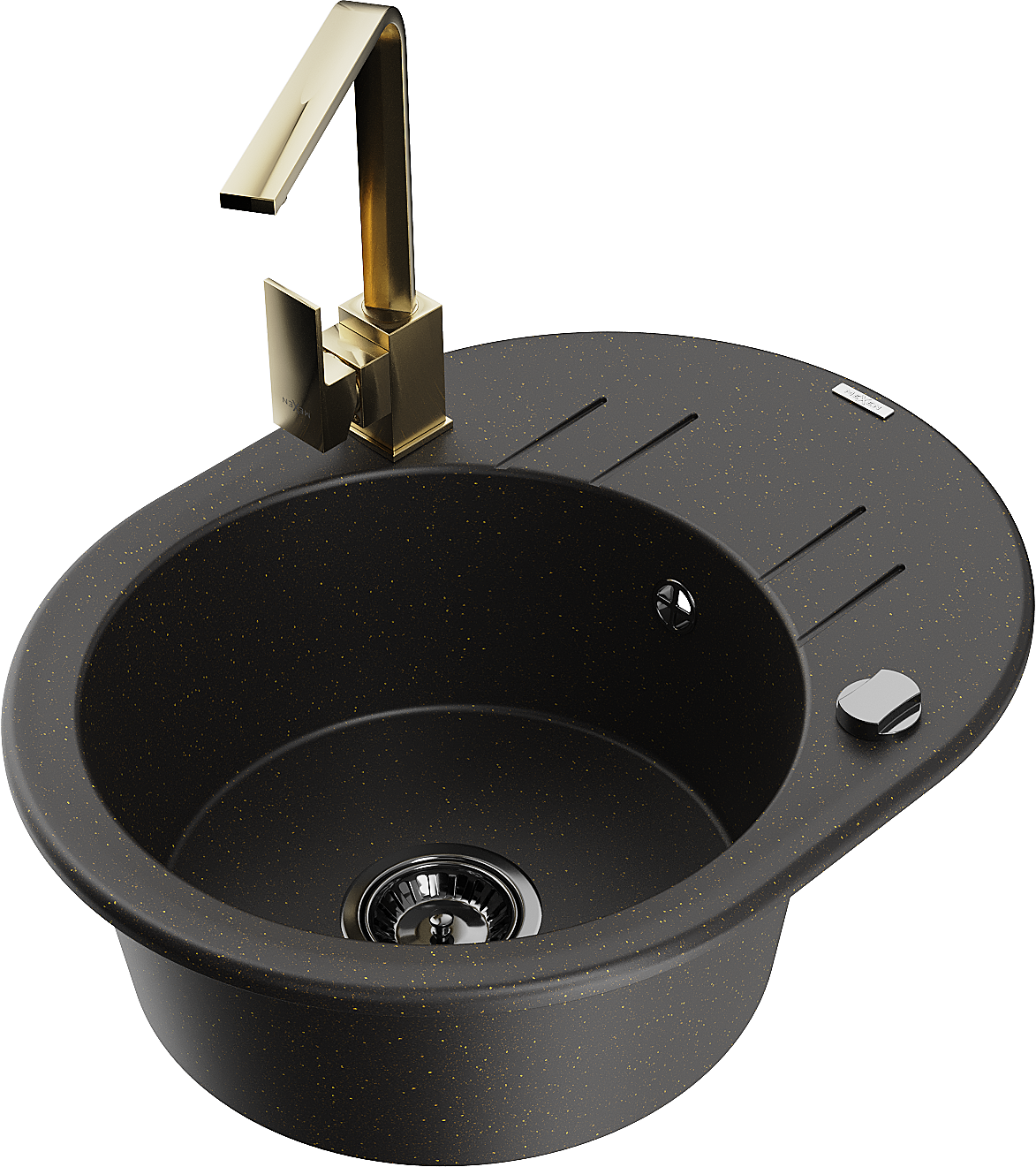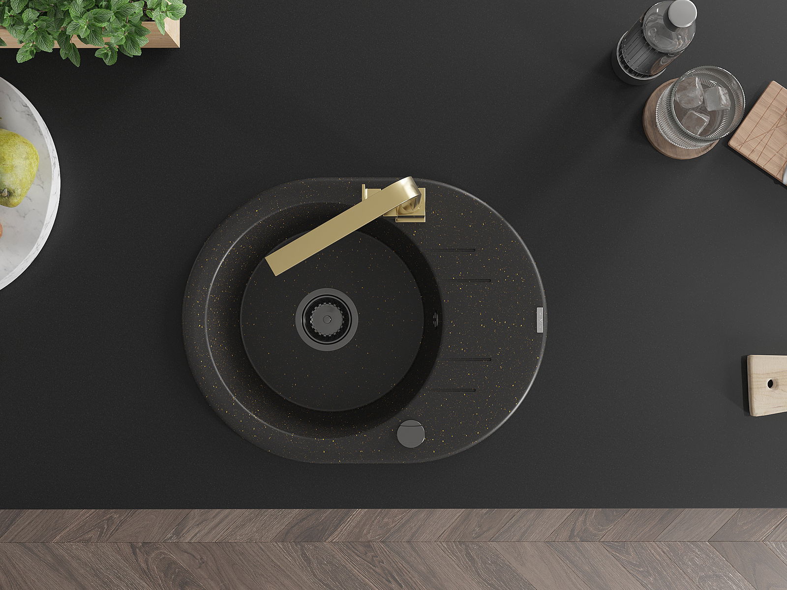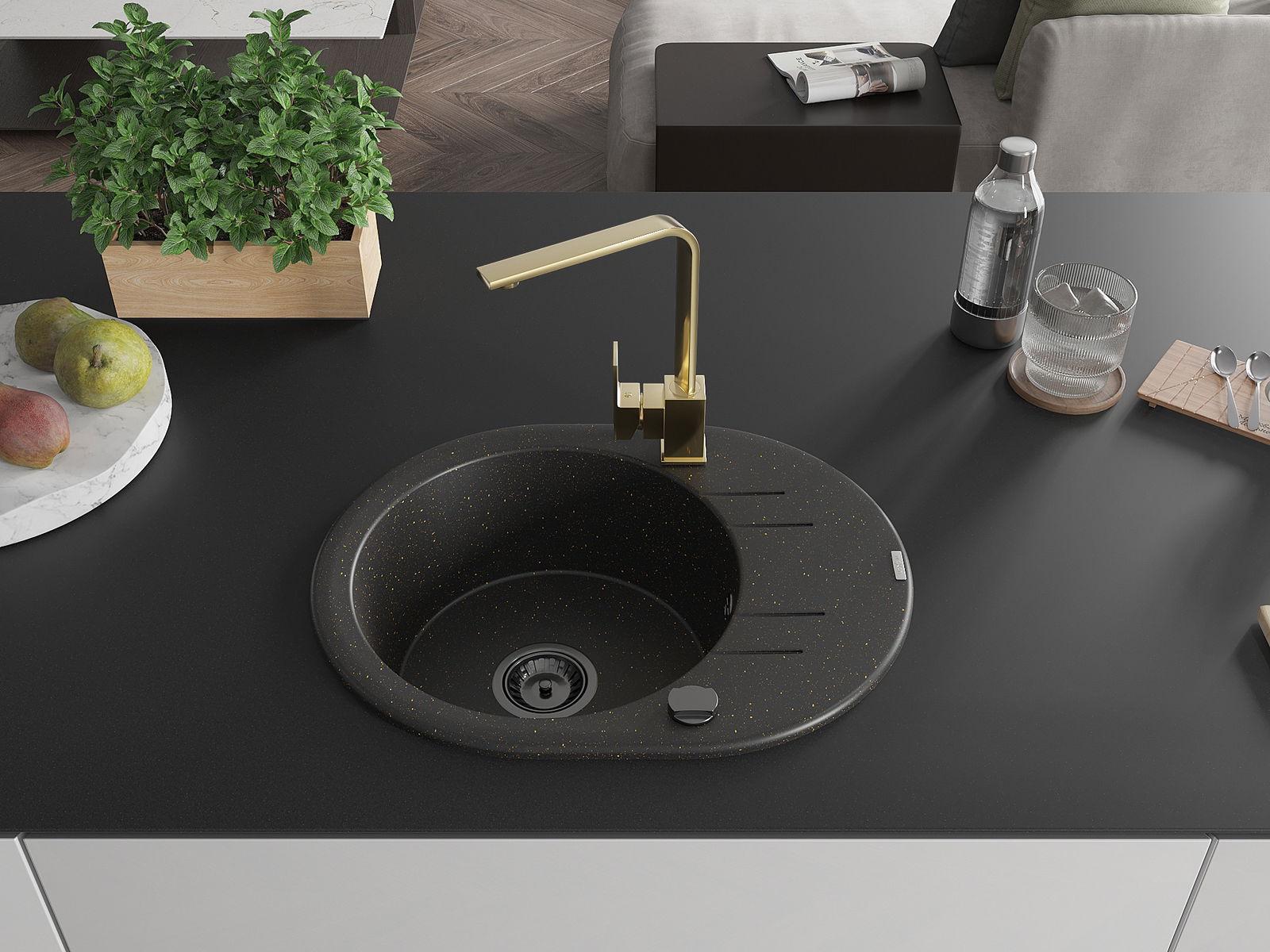 Mexen Kevin žulový dřez 1-komorový s odkapávačem a kuchyňskou baterií Rita, černý/zlatý metalický - 6517-75-670300-50-B