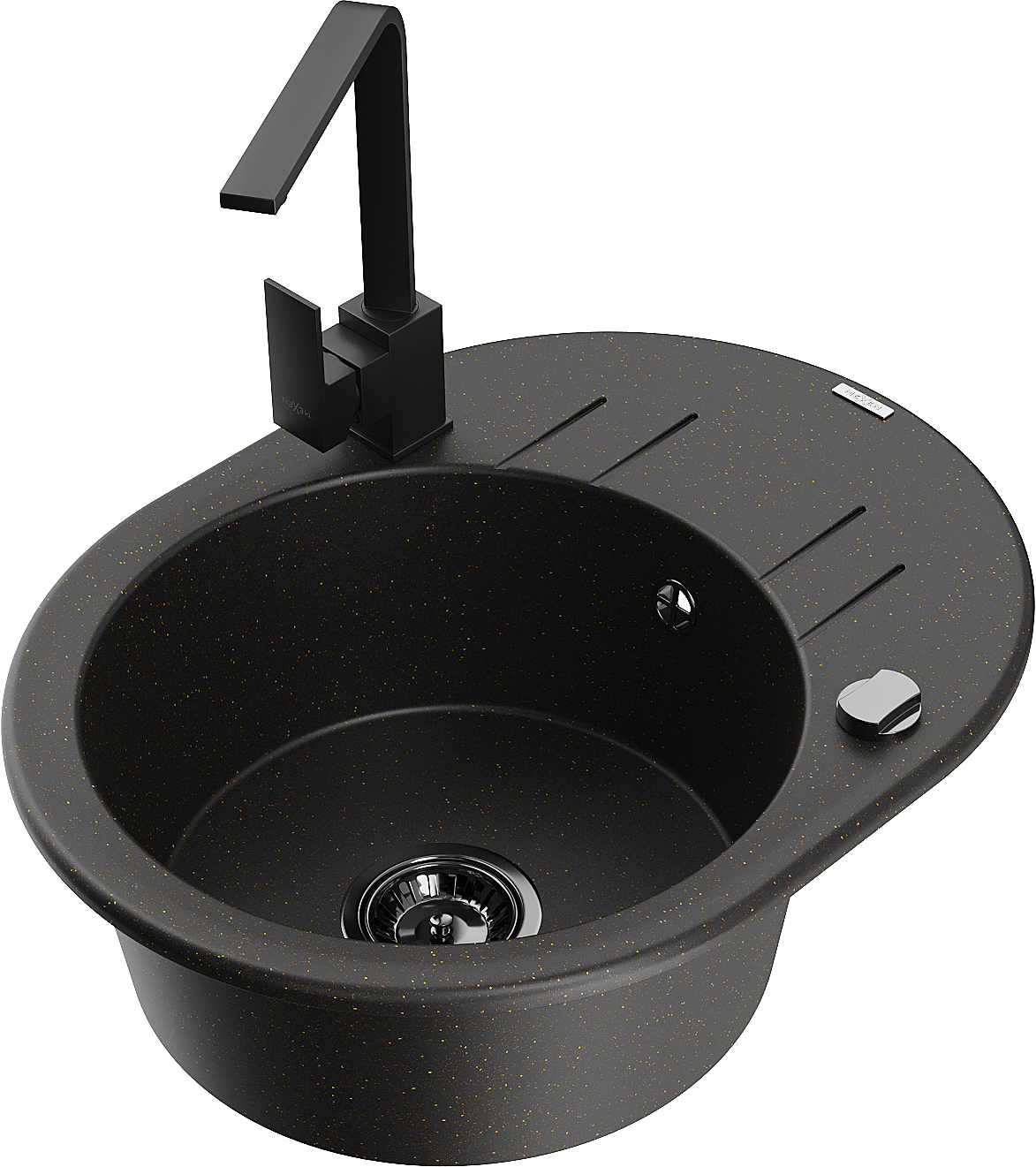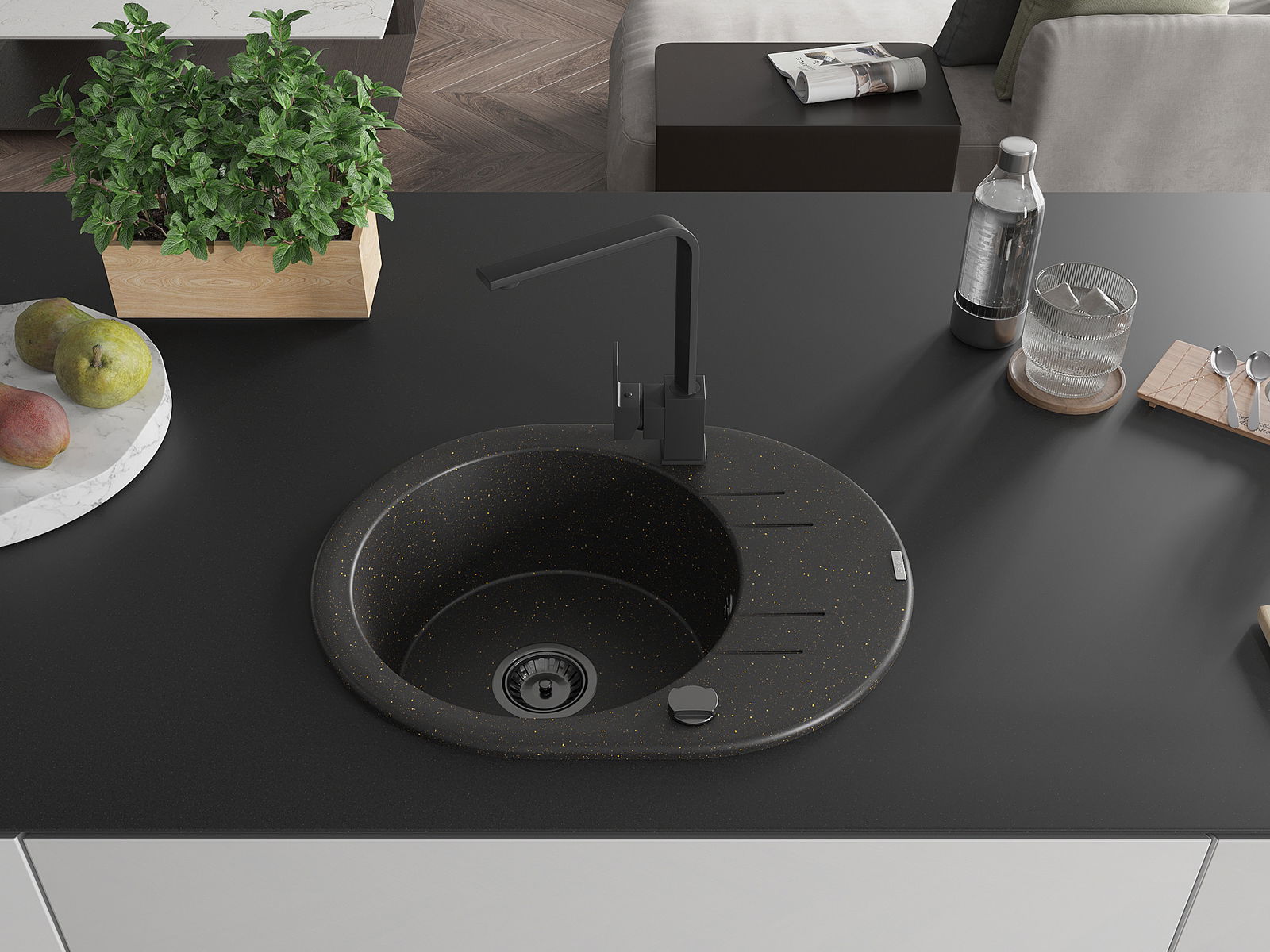 • Mexen Kevin žulový dřez 1-komorový s odkapávačem a kuchyňskou baterií Rita, černý/zlatý metalik - 6517-75-670300-70-B