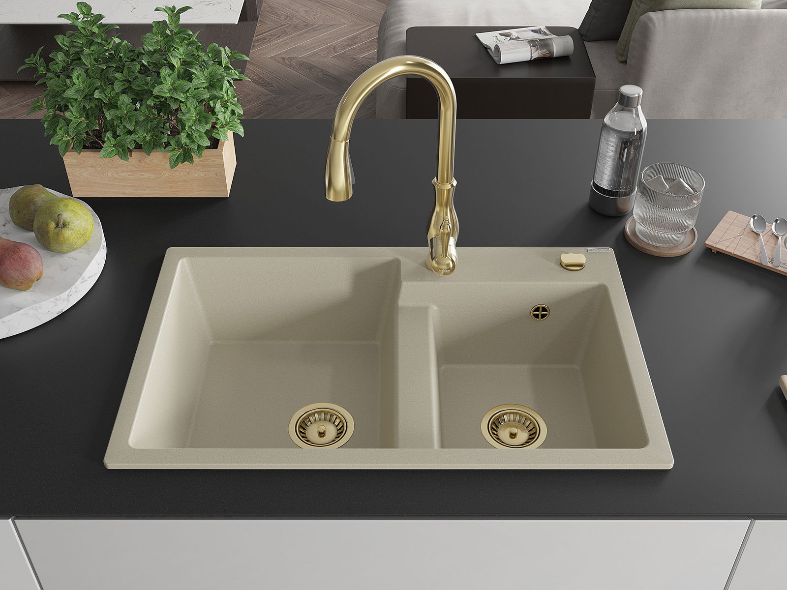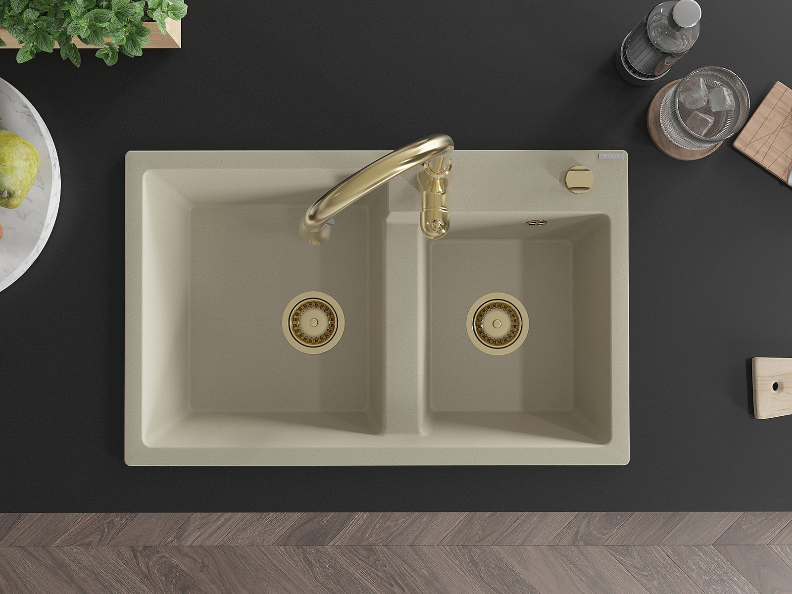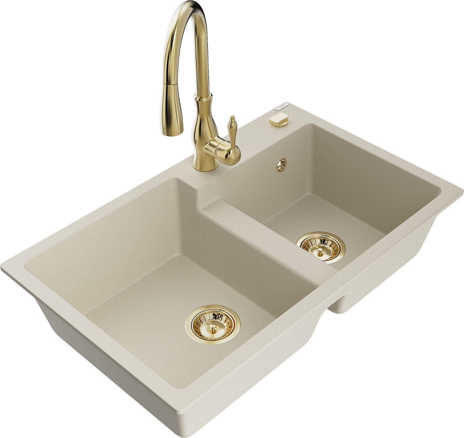 Mexen Tomas granitový dřez 2-komorový s kuchyňskou baterií Savita, béžový - 6516-69-672601-50