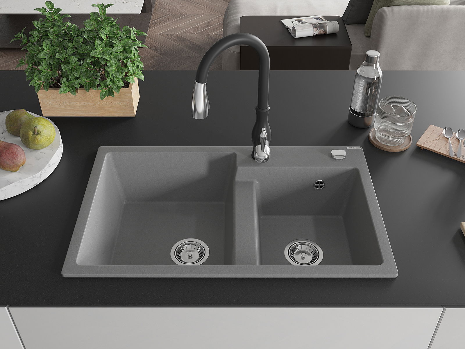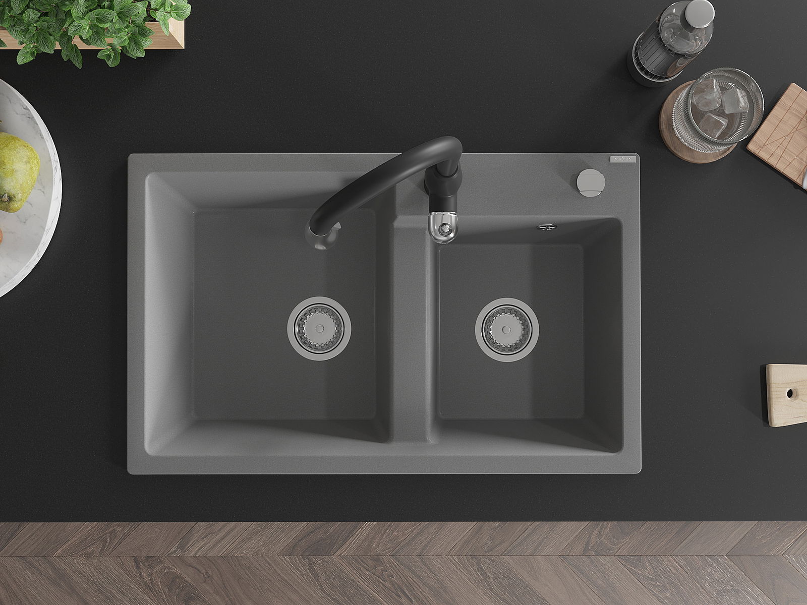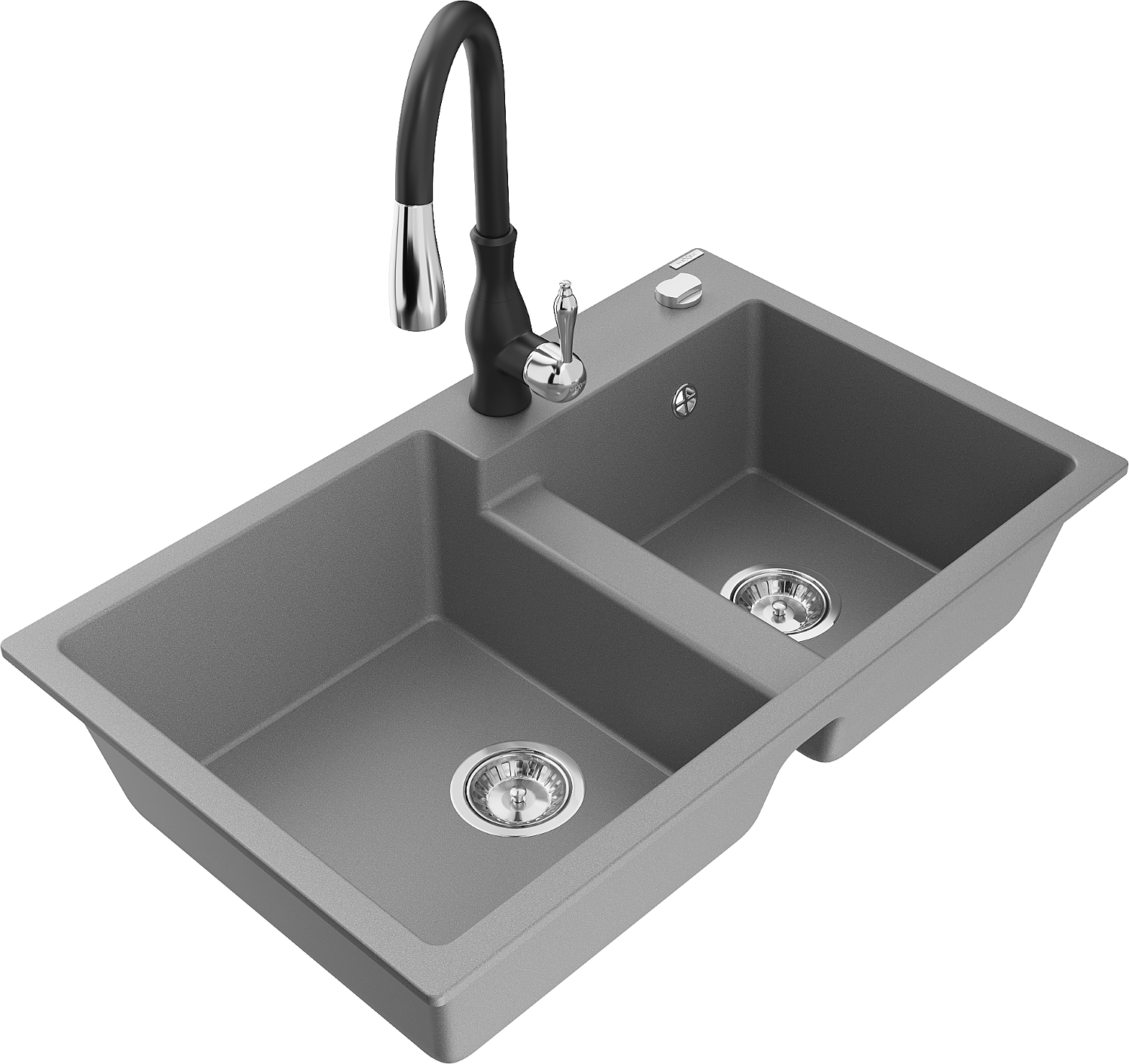 Mexen Tomas dřez granitový 2-komorový s kuchyňskou baterií Savita, šedý - 6516-71-672601-70